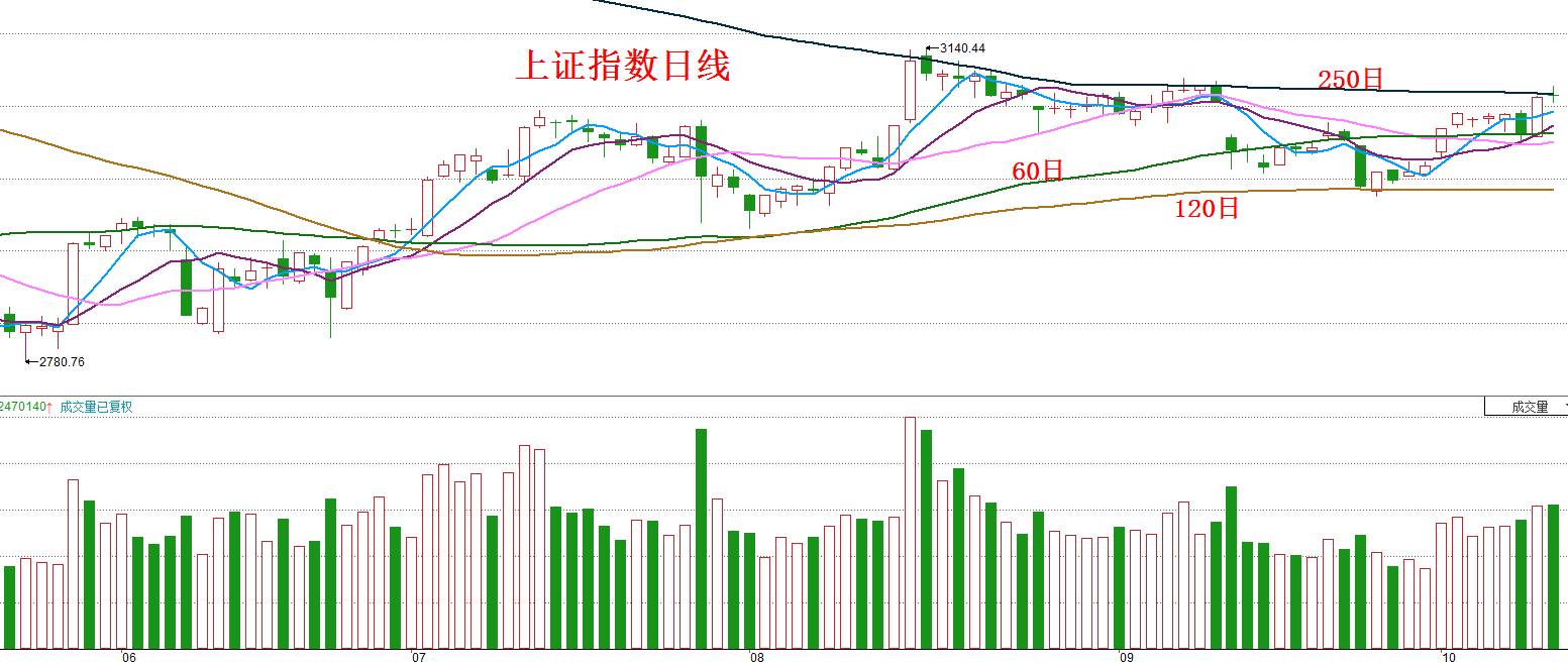 今天是上证指数第三次触碰到250日均线。第一次是在八月中旬,第二次是在9月上旬,都是刚触碰到250日均线就回落了,那么这次能够站稳250日均线吗?如果现在要站稳250日均线,那么就得承受住前期套牢盘的抛压,成交量就得继续有效放大,否则就会再次回落。从个人感觉而言,虽然我们对大盘的长期走势坚定看好,但对眼下能否成功站稳仍觉信心不足。我们过去曾经多次讲到均线扣抵,指出250日均线在未来两个多月的时间内都将逐步下移,所以我认为上证指数维持小幅震荡,待250日均线继续下移然后站稳的概率更大。在操作策略上,长线投资者可坚定看多自不待言,短线投资者可以六七成仓位为宜,寻找机会做高抛低吸。