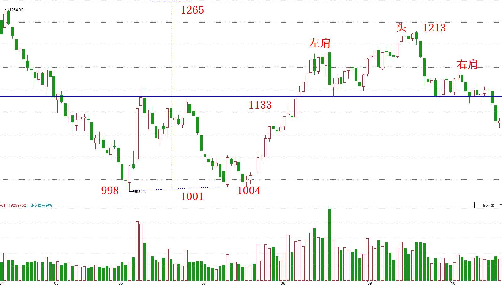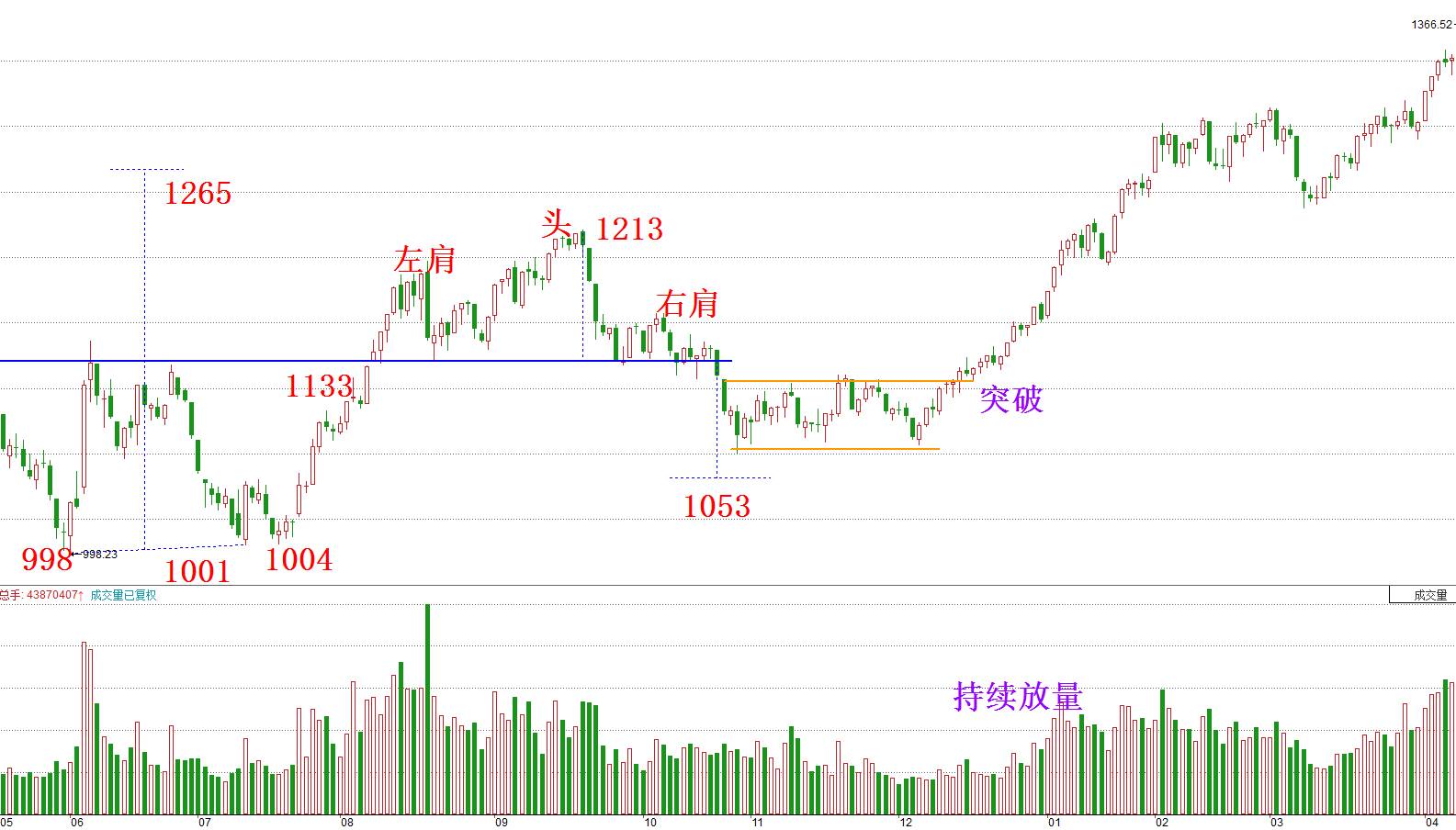 在这张图中,上证指数构筑的是双底,两个底分别是998点和1004点,颈线位在1133点。按照教科书的说法,上证指数的涨幅满足位应为: