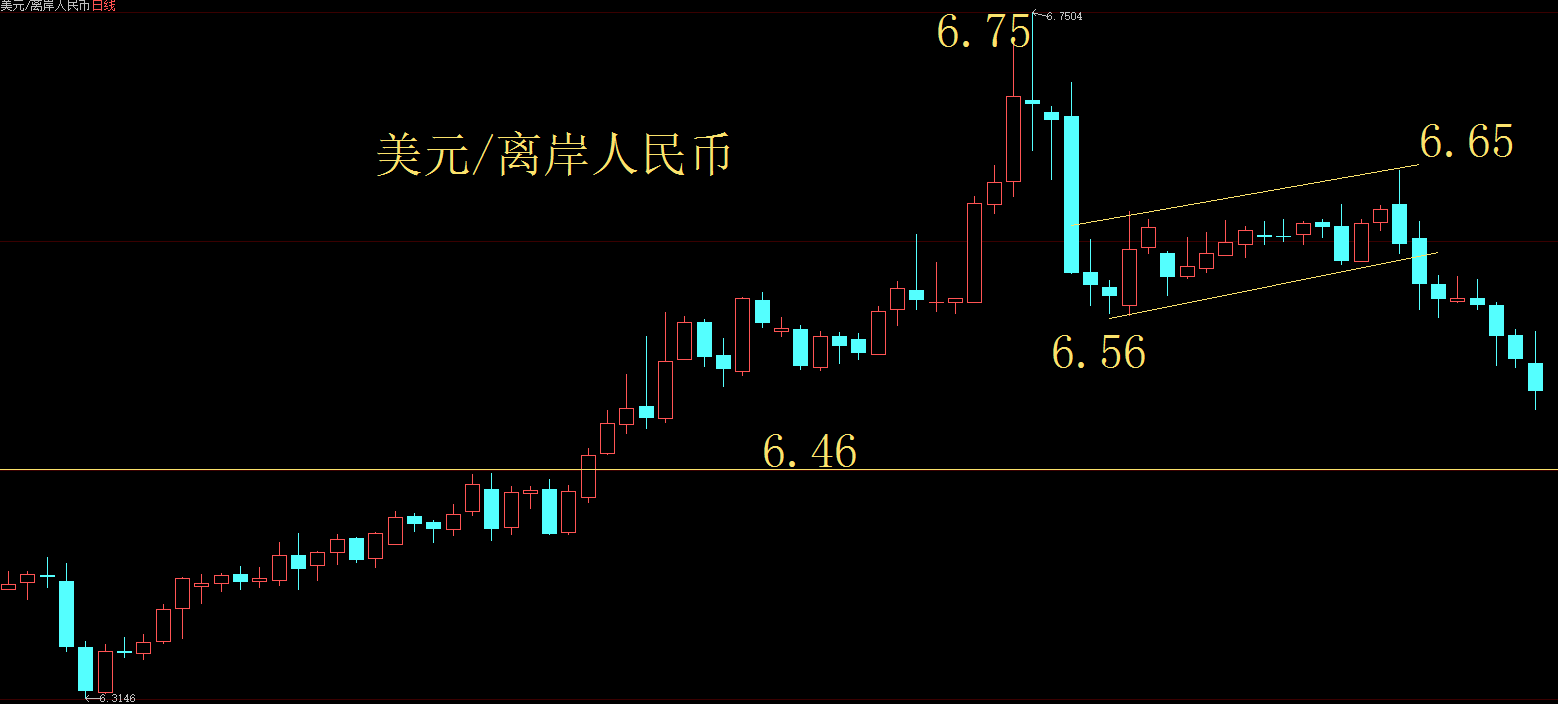 现在整个市场都在说即将开市的A股会因为国际股市的暴跌而补跌,但有没有人想过,也许就是A股休市而导致国际股市暴跌呢?虽然没有在公众号里明说,但私下和几个朋友聊天时,我们大概都猜到央行会在A股休市期间打金融战。下面这张美元/离岸人民币的日线图: