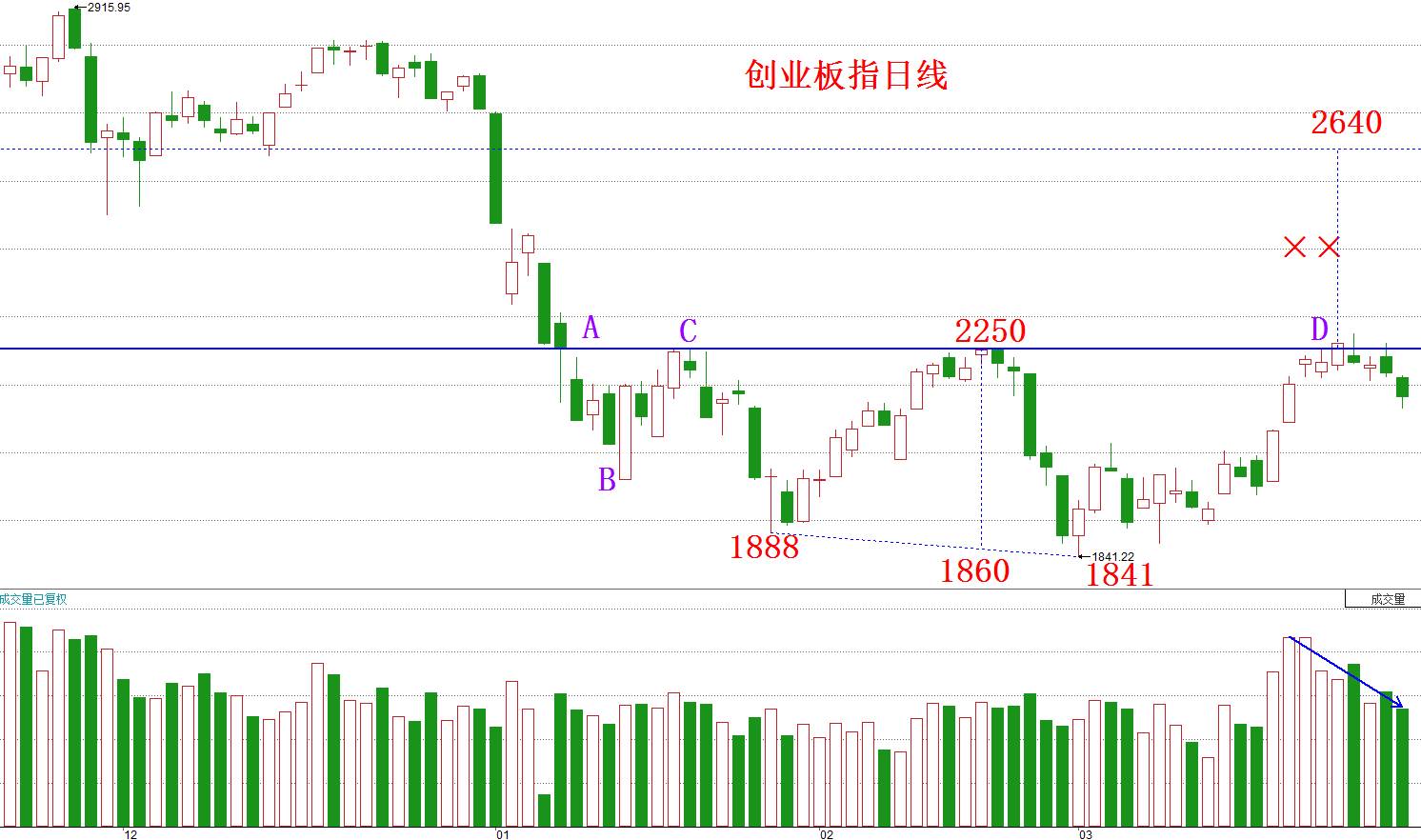 今天创业板指继续下跌,足以证实我们此前关于3月23日的阳线并非有效突破颈线的预测是正确的。现在所能期待的,就是创业板指果然能走出如双底左侧ABC的结构,回调之后再次对颈线发起冲击。但在市场给出明确信号之前,我们不必预设立场。短线投资者还是以静观为宜,当然长线还是坚定看好。
