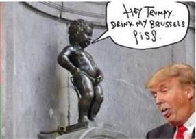 节目播出后,比利时一片哗然,布鲁塞尔大区首席大臣韦尔沃特通过发言人表示,他对特朗普关于布鲁塞尔的言论感到震惊,“我们向美国人保证,布鲁塞尔是一个多元文化城市,是一个理想的生活之地。”比利时网友更是用各种图文来表达对特朗普的鄙视,譬如下面这张: