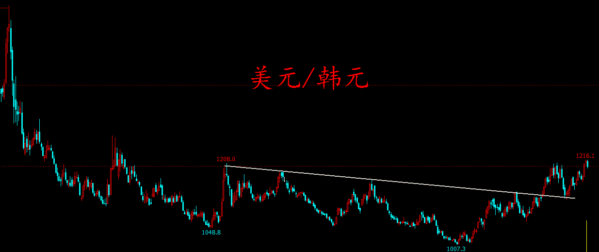 比如上面这张图是美元兑韩元的周线图,可以很容易发现韩元已经突破颈线后回踩再往上,后面的贬值空间还是相当大的。