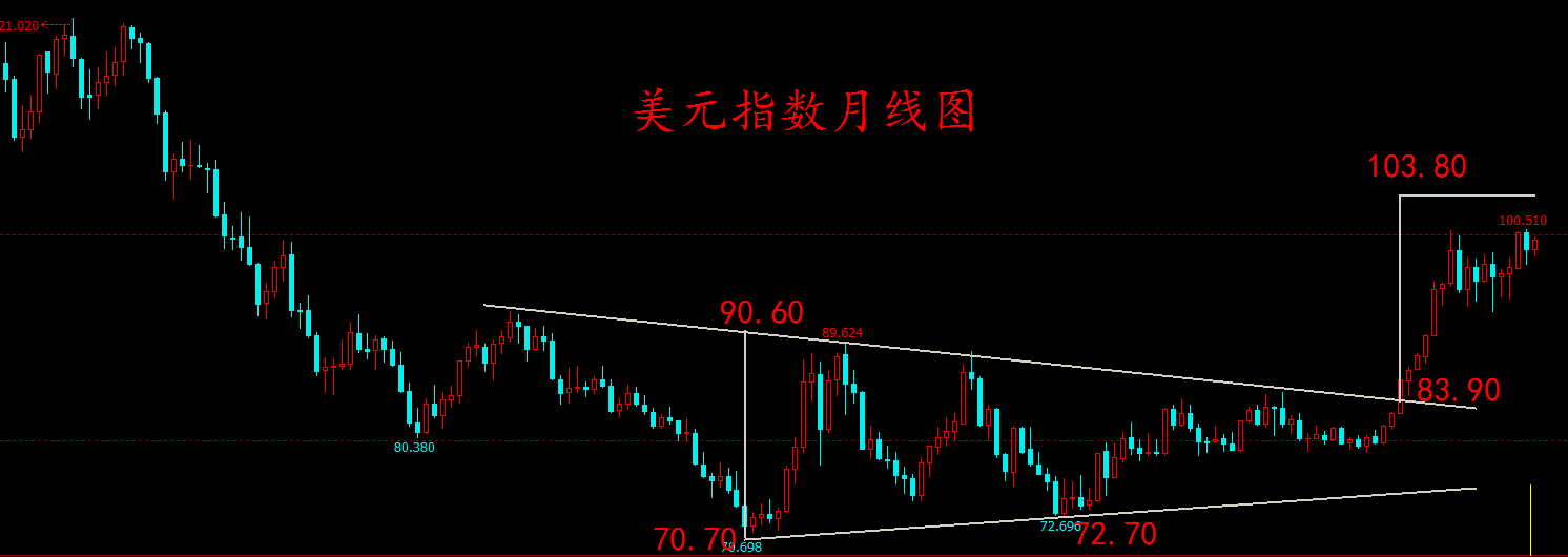 目前美元指数的最高位在100.51点,向上仍然还有空间。况且美元指数在底部构筑了如此长的时间,接下来的涨幅肯定不止一波,如果再来一波的话就将涨到123.70点,突破2001年的高点。