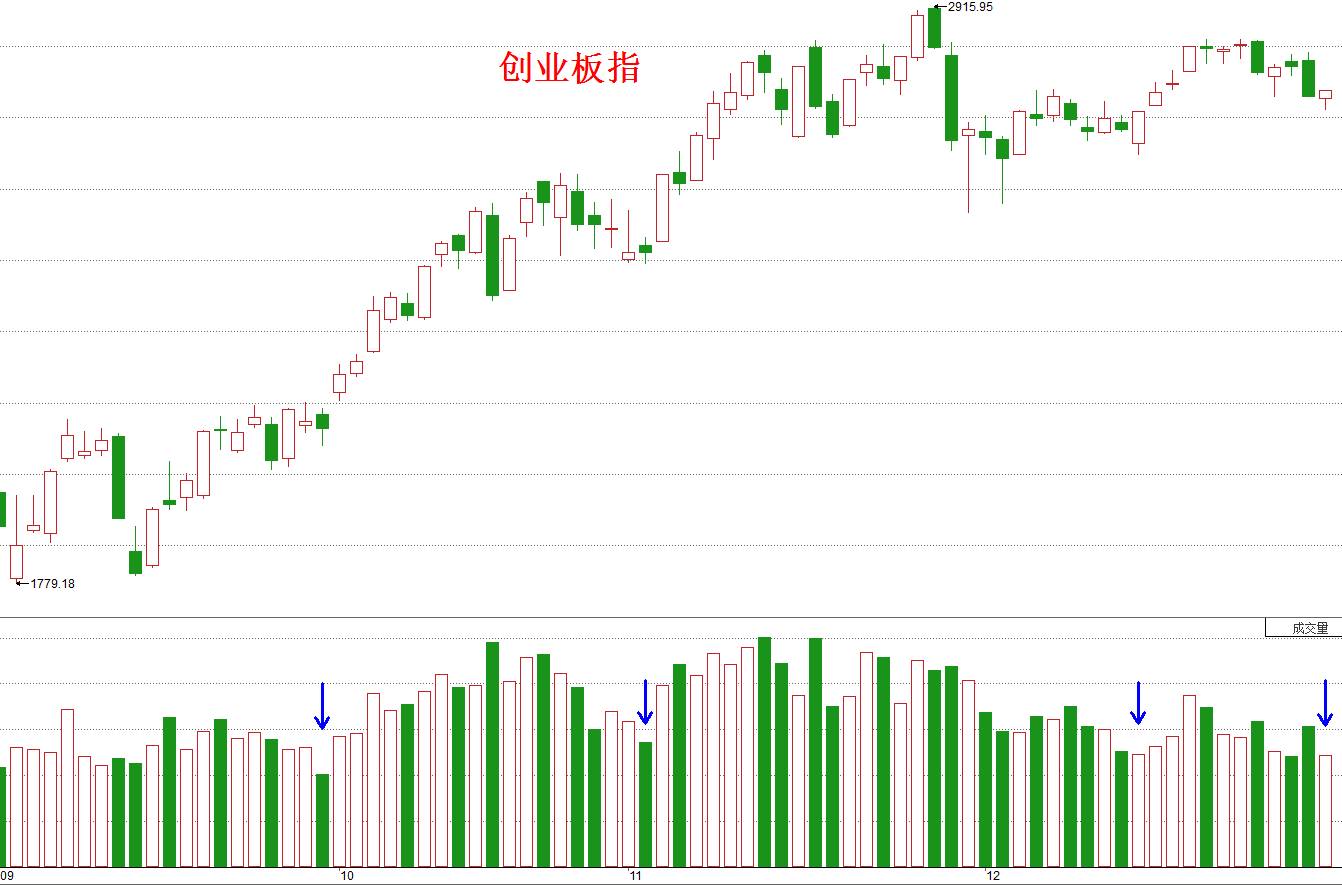 再说创业板。创业板指今天走势与主板极其类似,同样也是大阴线后的缩量小阳线,如下图所示: