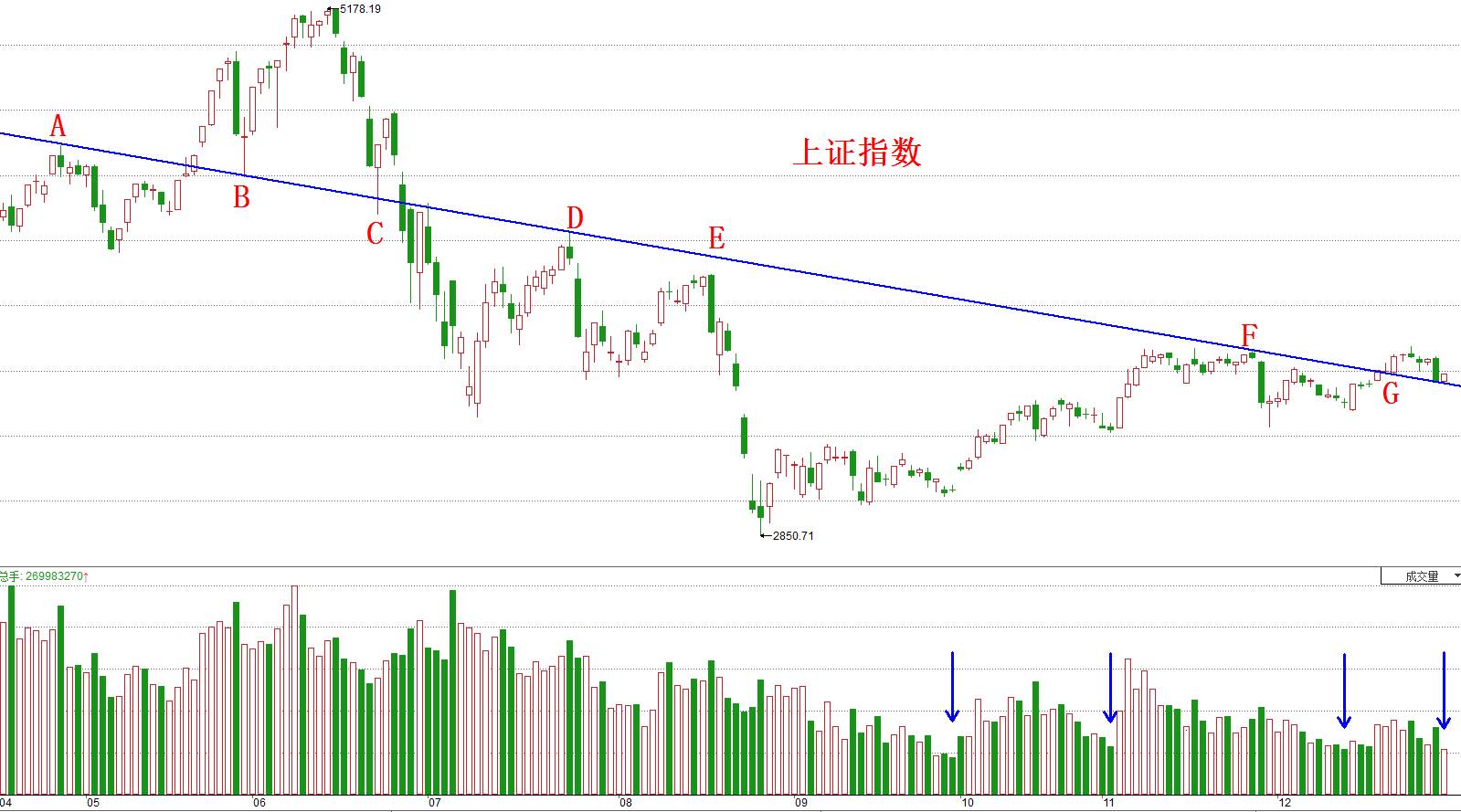 今日这根小阳线的收盘价越过了最日收盘价的低点,却未能达到昨日大阴线实体的一半。这样的K线组合意味着市场有反弹迹象,但反弹气势不强。为什么会气势不强,因为缺乏成交量支持。有读者留言问:“今天成交量这么少,为何还拼命拉指数?”其实,这哪里是拼命拉指数,全天涨幅连1%都不到!只是因为前三个小时波动实在太小,才使得最后一个小时只涨23点在分时图上就显得像是在“拉指数”。前三个小时的无量窄幅震荡,表明市场其实已经没什么人愿意卖了,所以最后一个小时轻飘飘就可以拉起来。