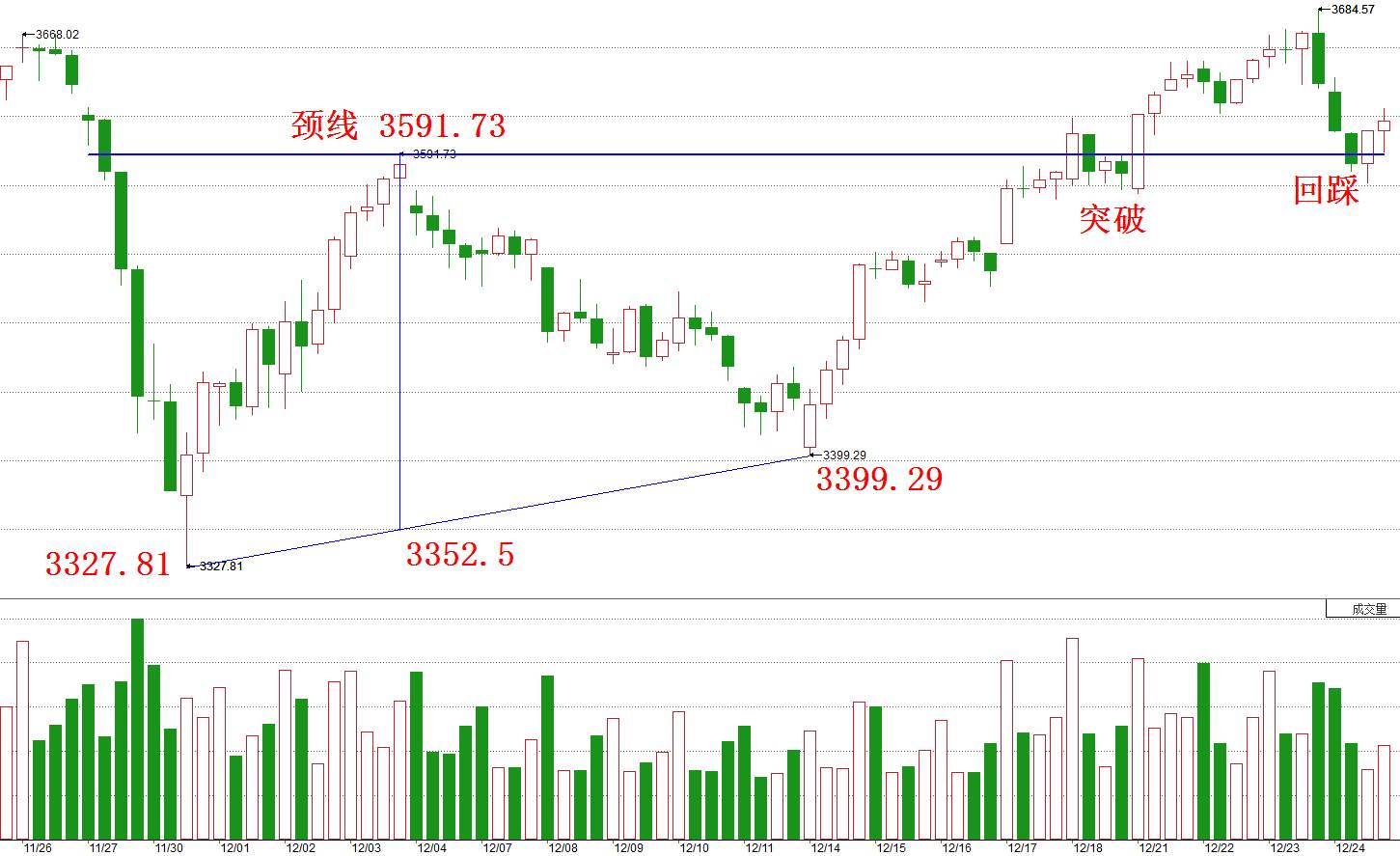 现在我们再回到最初的上证指数60分钟K线图,以第一个反弹高点3591.71点做一条水平线,是为颈线。连接两个底部的低点3327.81和3399.29点,以3591.7点那天往下作垂线,其与底部连线的交点约为3352.5点。