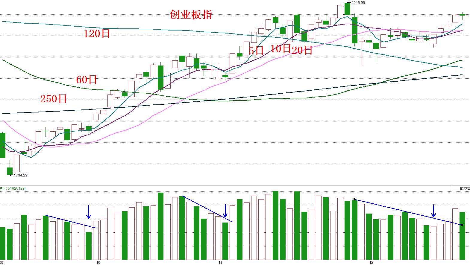 就在周五,创业板指的十日均线上穿二十日均线。至此,创业板指的均线系统已经完全呈现多头排列的走势,如下图所示: