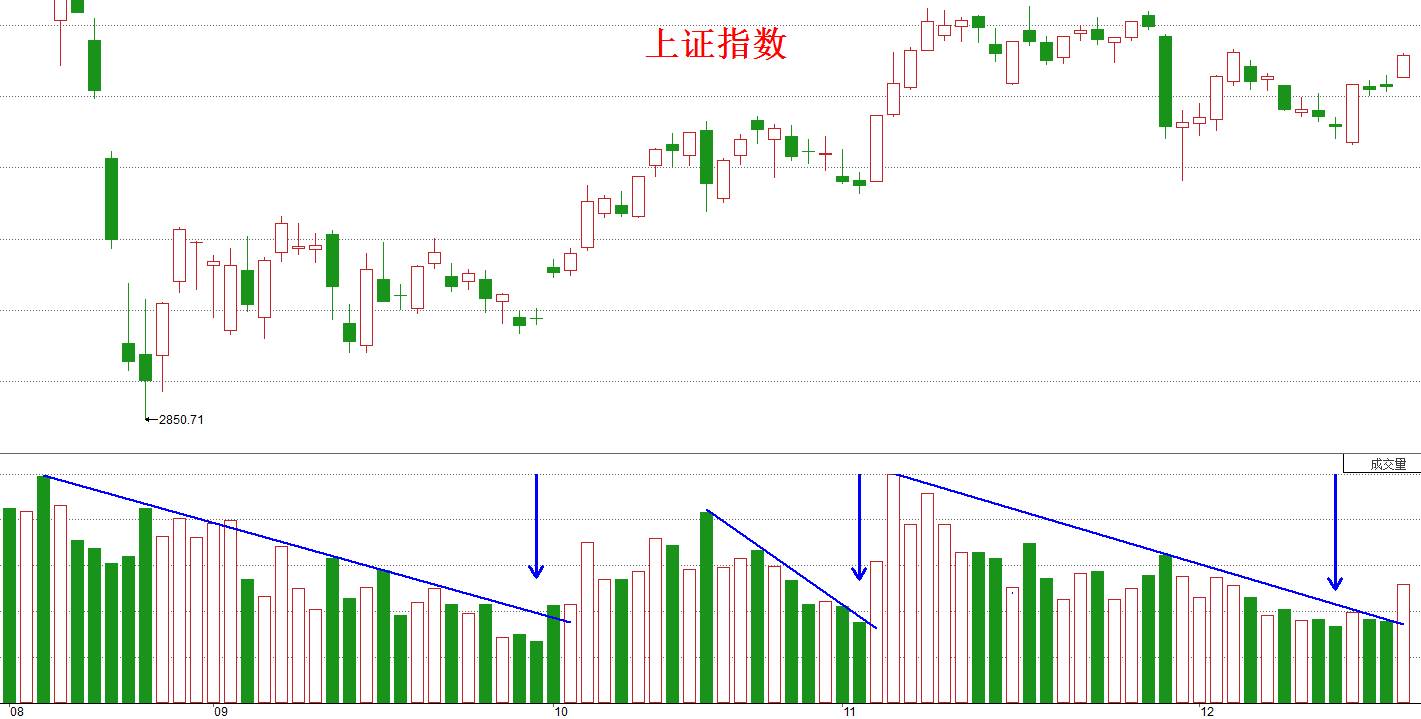 这张图我们天天在讲,读者应该印象相当深刻了。我们一直强调前期成交量缩到极限就是底部,之后成交量有效放大并突破量能趋势线就是一波新涨势的开始。今天这根放量阳线就是突破了趋势线, 看看前几次突破量能趋势线指数是怎么走的?你怎么知道接下来不会这么走呢?前两次你感觉对了吗?