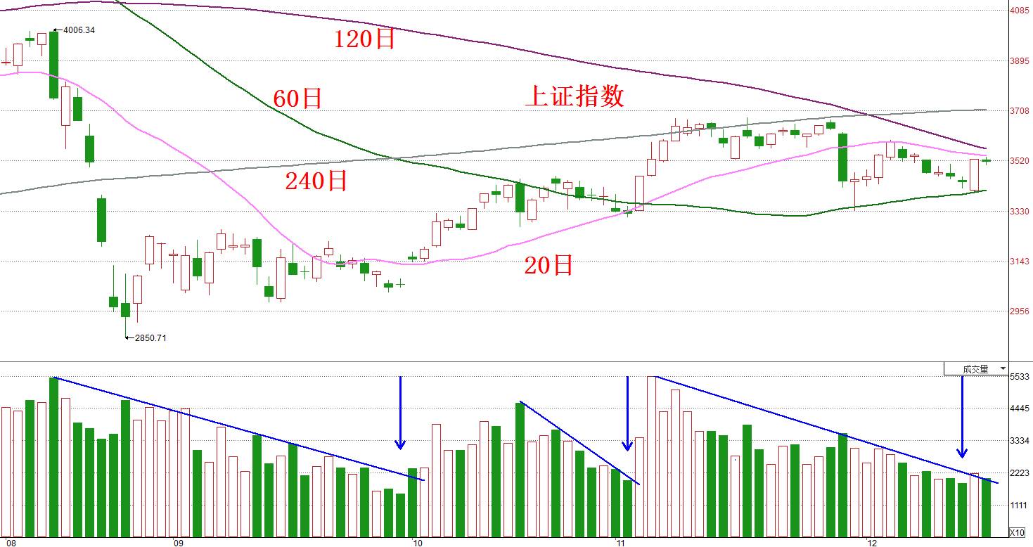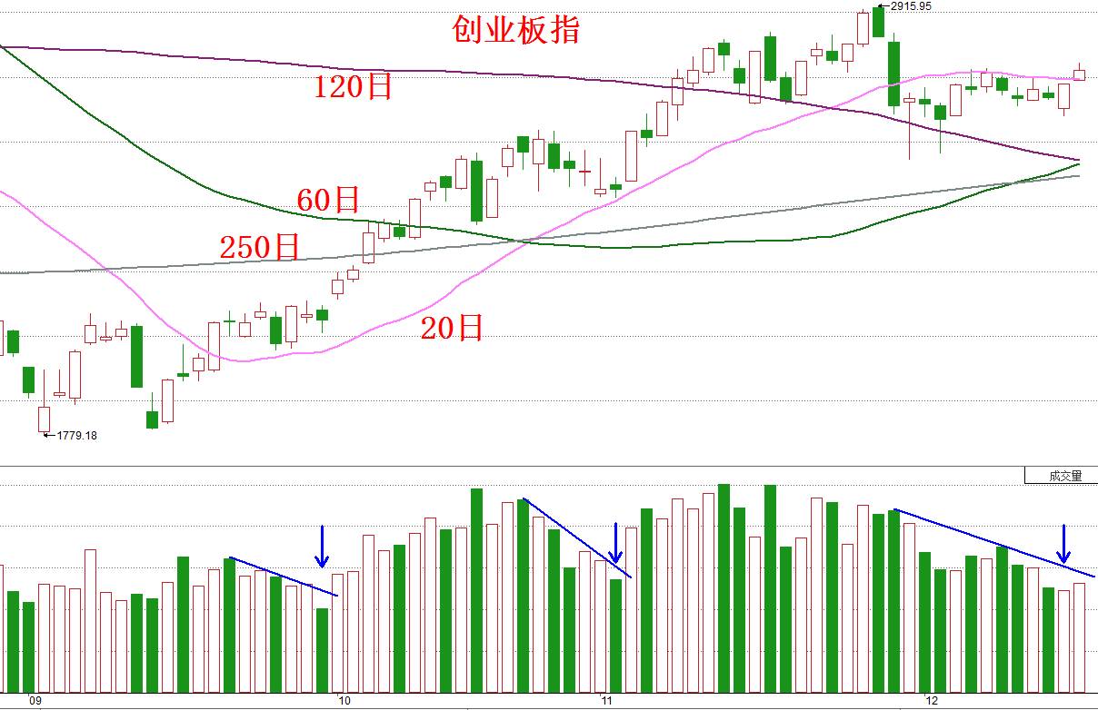 再说创业板。今日创业板指早盘小幅跳空高开,之后一路上冲到2764点,收盘报2745点,全天上涨36点。好消息是开盘就开在20日均线附近,并且收盘也稳稳站在20日均线之上。另外,60日均线与120日均线的差距仅剩下10点,很快就能黄金交叉了。只是今天创业板指成交量虽略高于昨天,但还是未能有效放大,如下图所示:
