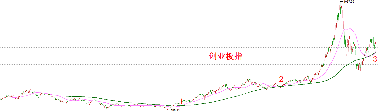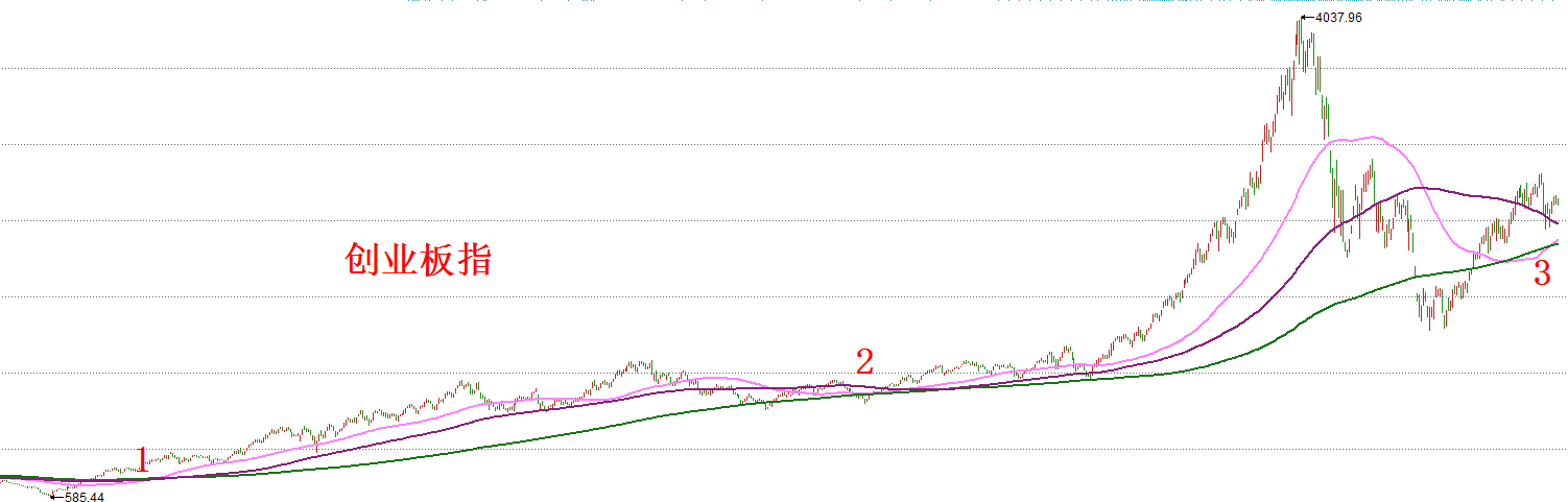 图中加了一条120日均线,也就是紫色线。我们可以清楚看到在“1”和“2”的行情中,都是60日、120日和250日均线形成多头排列后开始快速大涨的,可现在创业板指时机还不成熟啊!120日均线还在60日均线上方,现在怎么能快速大涨呢?