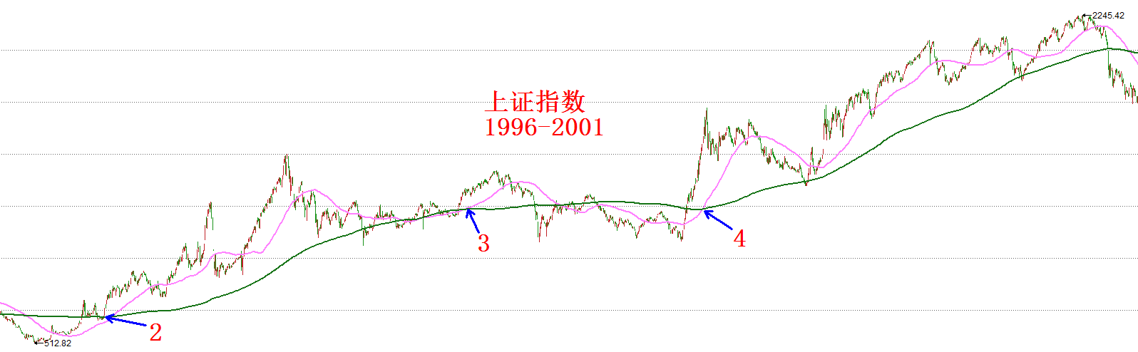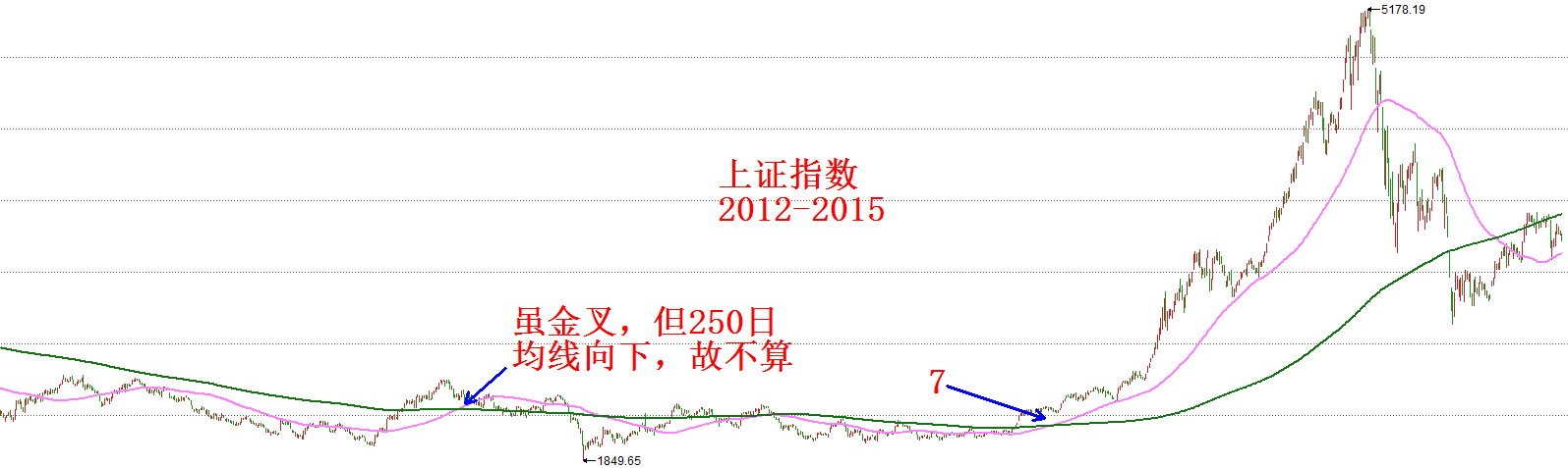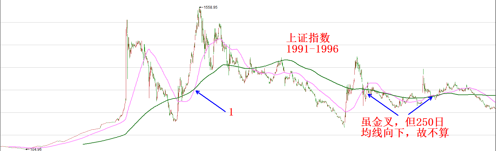 如果你觉得创业板指历史太短,样本数量不够,那我们就把上证指数有史以来的日K线图全部调取出来,将250日均线向上时,60日均线上穿250日均线的走势标示如下: