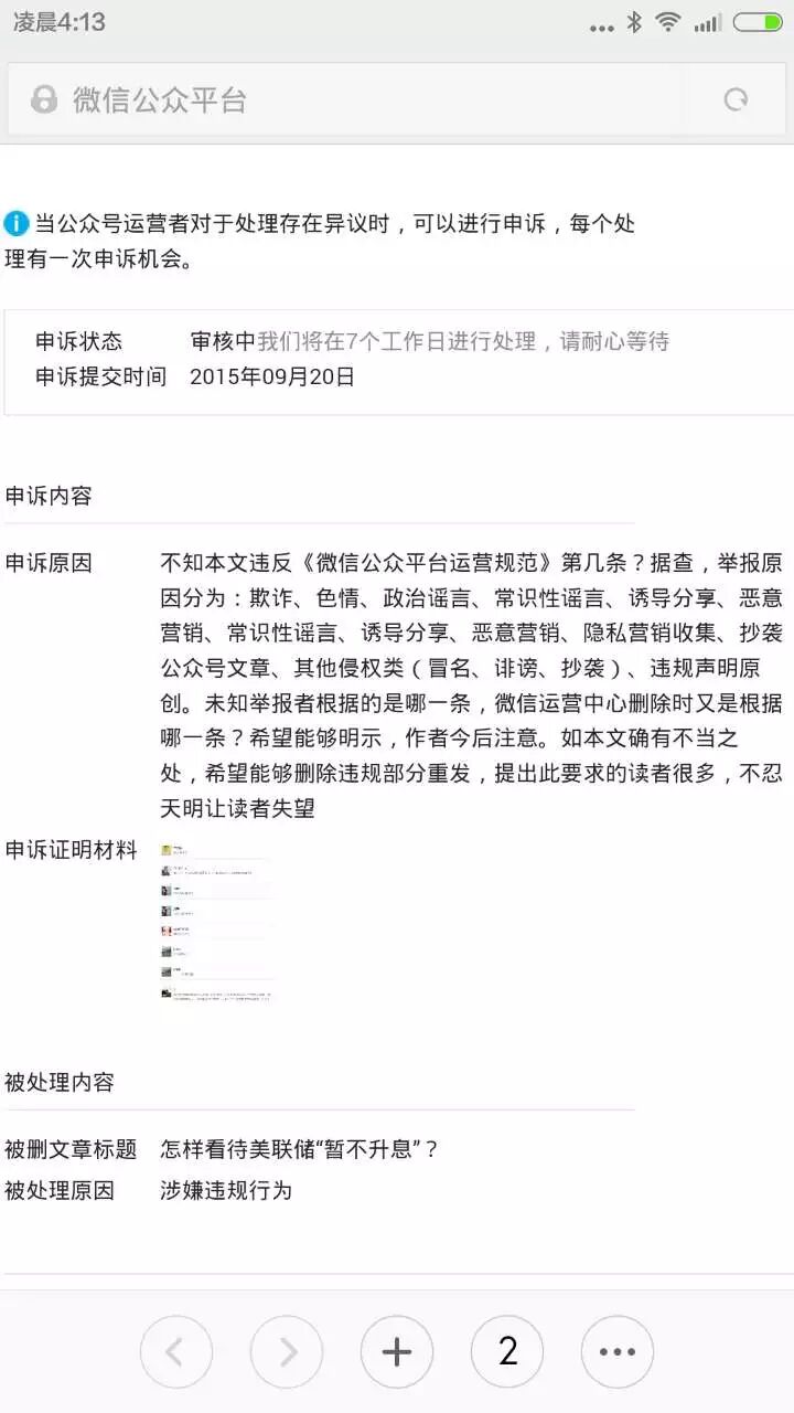 不知本文违反《微信公众平台运营规范》第几条?据查,举报原因分为:欺诈、色情、政治谣言、常识性谣言、诱导分享、恶意营销、常识性谣言、诱导分享、恶意营销、隐私营销收集、抄袭公众号文章、其他侵权类(冒名、诽谤、抄袭)、违规声明原创。未知举报者根据的是哪一条,微信运营中心删除时又是根据哪一条?希望能够明示,作者今后注意。如本文确有不当之处,希望能够删除违规部分重发,提出此要求的读者很多,不忍天明让读者失望