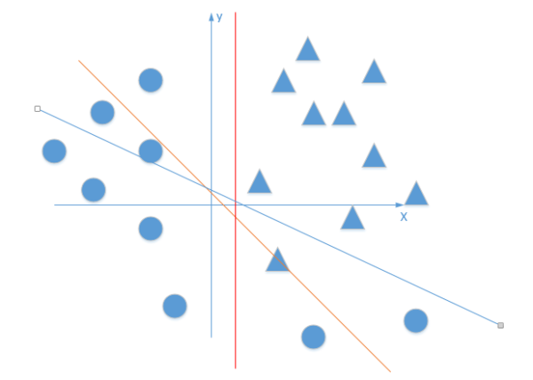 就好像下图,直线无论在平面上如果旋转,都不可能完全正确的分开三角形和圆形点: