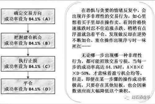 常规情况下,期货交易有四个必须的步骤,分别为确定交易方向、把握建仓机会、执行止损(若有反向波动)及平仓。任何一步走错,都可能导致交易亏损。期货交易者在一定时限内的成功率应为每一步成功率的乘积。假设每次交易的赢亏额度均相当,当四个步骤的成功率均达到84.1%时,交易成功率才勉强站在盈亏平衡线上。