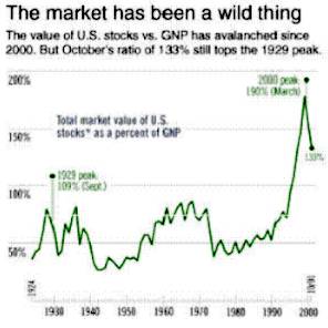 On a macro basis, quantification doesn't have to be complicated at all. Below is a chart, starting almost 80 years ago and really quite fundamental in what it says. The chart shows the market value of all publicly traded securities as a percentage of the country's business--that is, as a percentage of GNP. The ratio has certain limitations in telling you what you need to know. Still, it is probably the best single measure of where valuations stand at any given moment. And as you can see, nearly two years ago the ratio rose to an unprecedented level. That should have been a very strong warning signal.