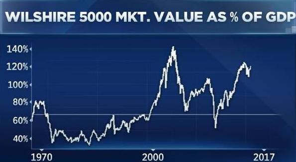 经此修改之后,美股2000年顶峰时的巴菲特指标大约在140%,而近来美股的巴菲特指标始终在120%以上运行,最高来到130%,如下图所示: