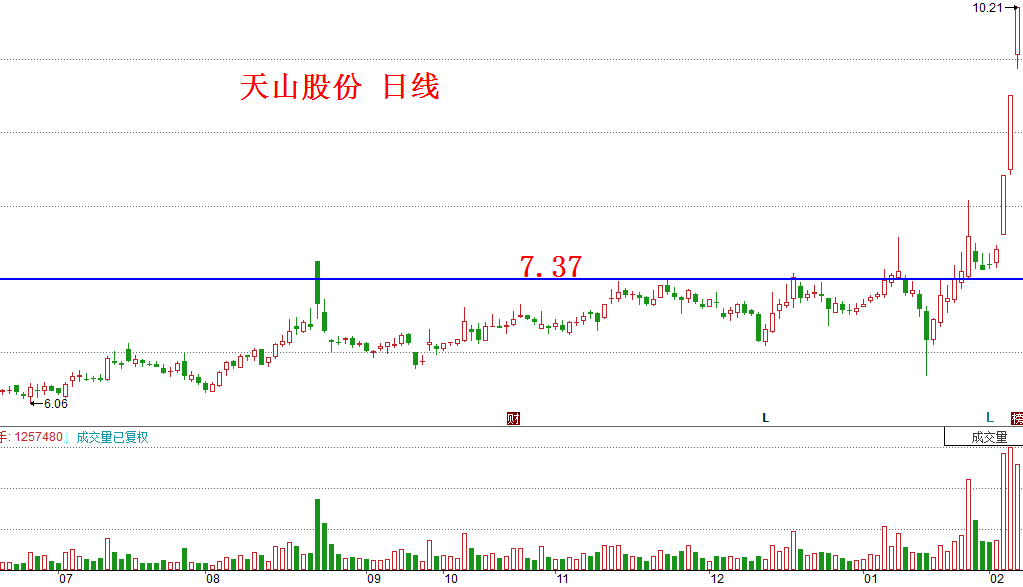 第三,近期内平台上方没有太多套牢盘。(天山股份7.37元之上的套牢盘在2015年)
