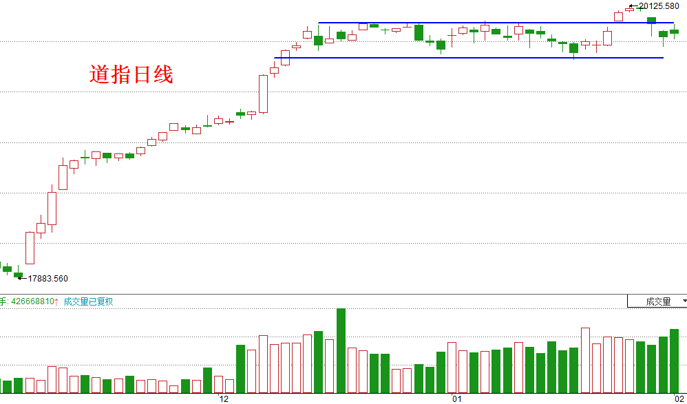 我们回过头再来看道指的走势图,看看20125点,这个非常类似于6124和5178点的数字,有没有可能成为美股的头部,如下图所示: