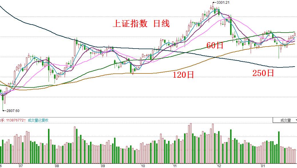 年前最后一个交易日,上证指数上涨9.62点,收盘报3159.17点,成交量为1250亿元,如下图所示: