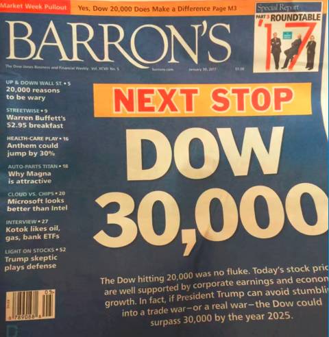果然,道指在1月25日正式突破两万点大关,26日最高来到20125.58点,而正如我们所预期的,当道指站稳两万点大关后,媒体立刻开始憧憬更高目标了,下面这张是《巴伦周刊》1月28日的封面: