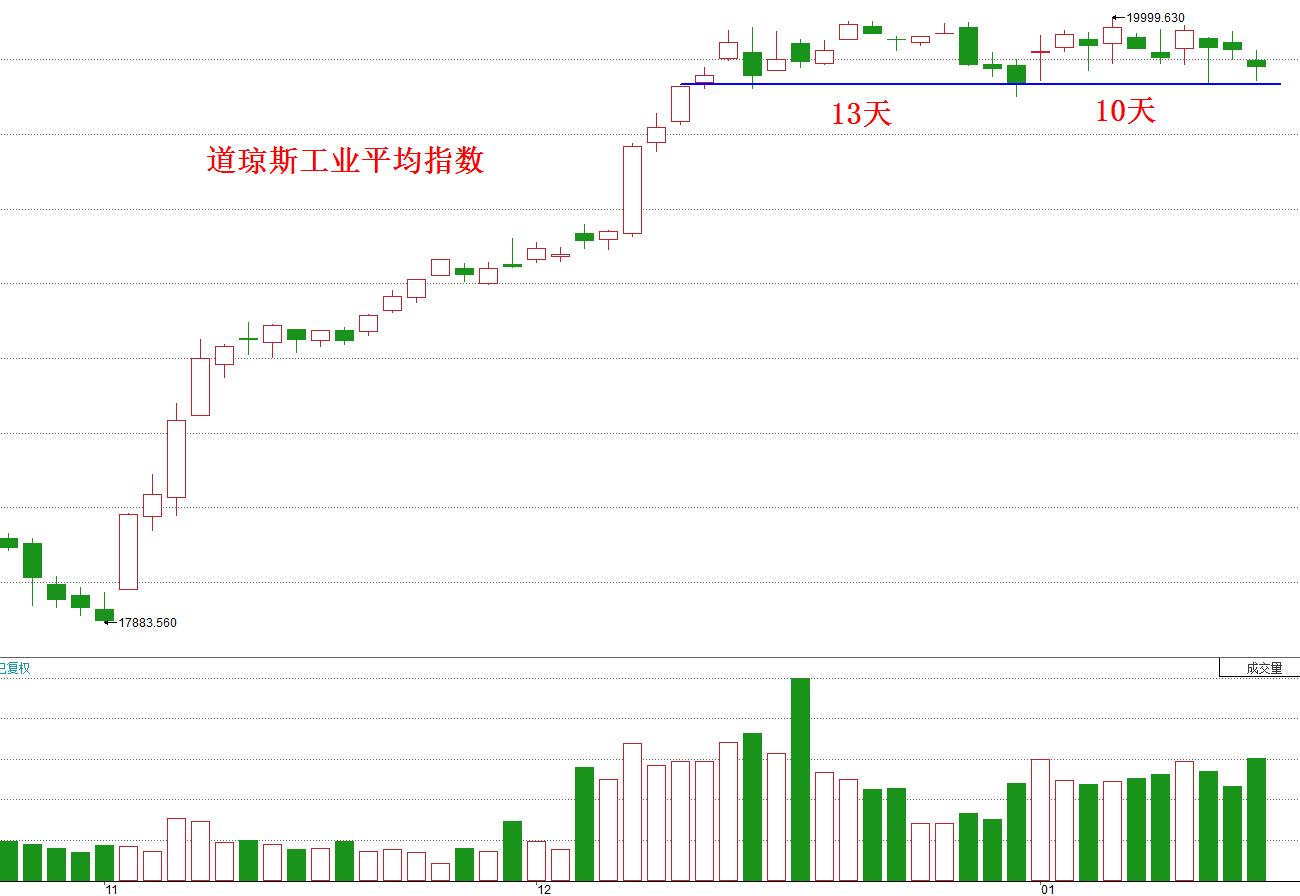 在特朗普当选的11月9日,美股展开新一波上涨行情,然而自12月中旬开始,这股上涨势头就被压抑住了,只能在窄幅区间内来回震荡,且隐隐然走成了双头的形态。从时间来看,左边的头部已经运行了13天,右边的头部现在已经运行了10天,距离特朗普20日就任刚好还有三个交易日。那么,有没有可能美股会在特朗普就任后出现一根跌破颈线的阴线呢?我们拭目以待。