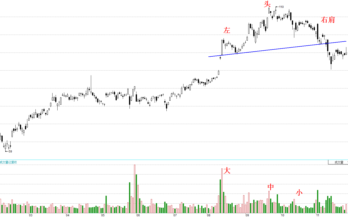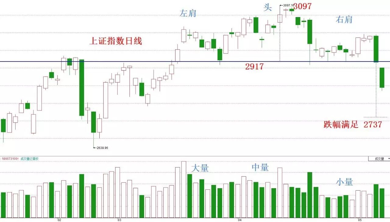 我们不难发现,上图就是比较标准的头肩顶,不仅形态上如此,成交量部分也符合“左肩最大,头部次之,右肩最小”的规律,直到破位跌穿颈线才又放的量。