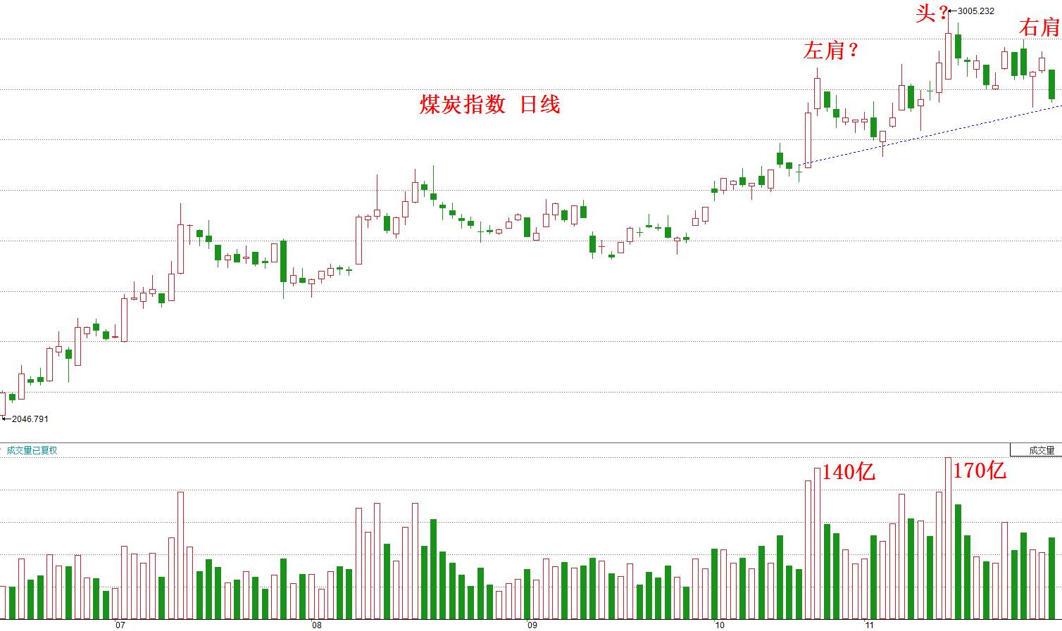 请大家再仔细看一下这张煤炭指数日线图,有没有觉得它有点像头肩顶?