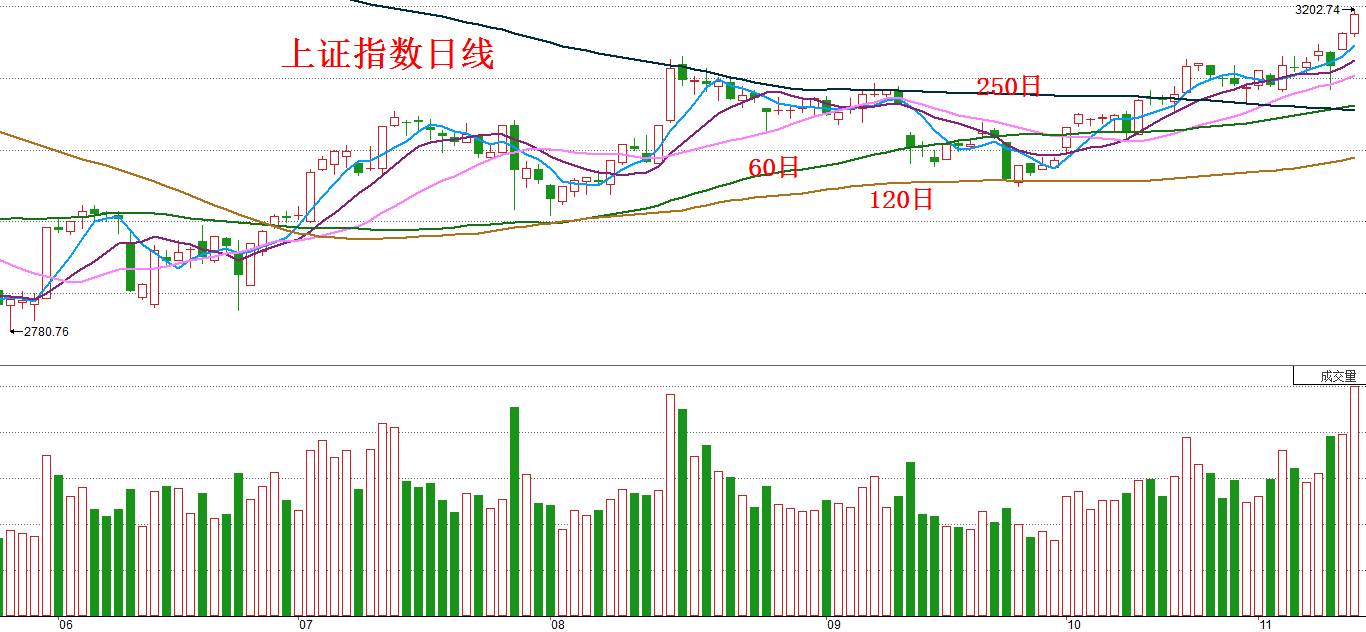 周五上证指数上涨24.76点,收盘报3196.04点,成交量为3438亿元,如下图所示: