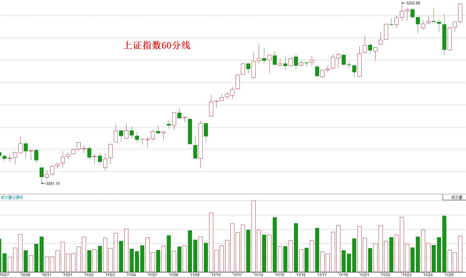从图中可以看到,上证指数下跌一小时,上涨三小时,且以最高价收盘。可是通过与前几个交易日的对比可以发现,周五跌的那一个小时是放量的,涨的那三个小时都是缩量的,这在技术分析上显然不是太好的现象。