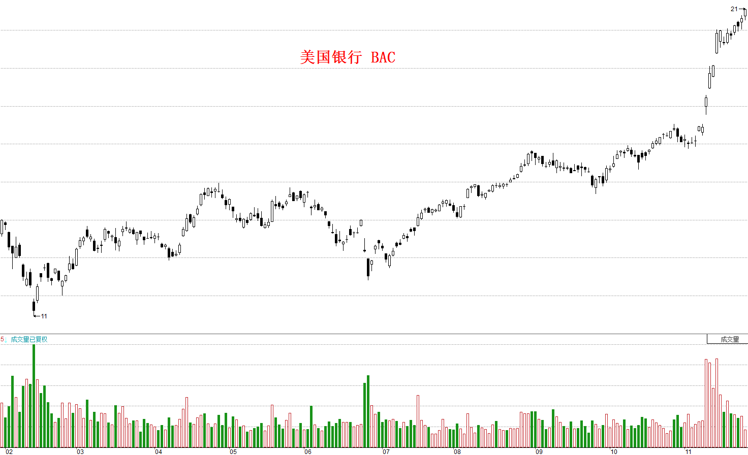 通过上图我们可以看到,本月真正带动美股上涨的是以高盛、花旗、美银为代表的银行股,尤其特朗普9日当选后更是连续拉出放量长阳。那么,特朗普当选对银行股构成了什么利好呢?