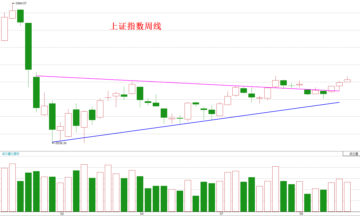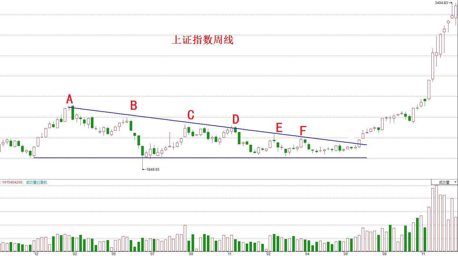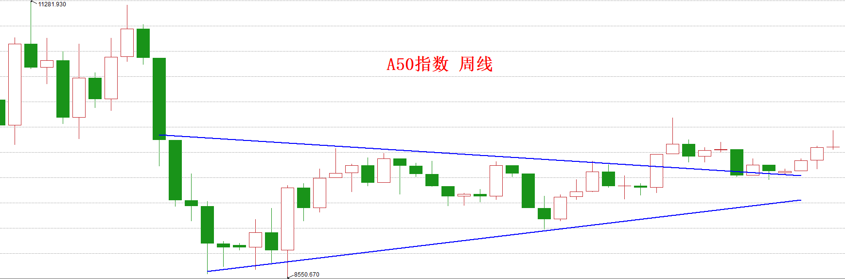 图中同样是三角形底部。指数靠着多方力量的推动逐步上升直至A点,之后由于多方力量不如空方而逐步回落,之后又在多方力量的反弹下到达B点,又因多方力竭再次回落,乃至于后面的C点、D点、E点、F点,将这几个高点相连接所得到的直线就叫作颈线。颈线就相当于多空双方互相焦灼拉锯的防线,一旦多方有效突破颈线,那就意味着空方在这条防线上已经无力阻挡,只能后退构筑下一道防线,这也就是我们每次在指数或股价突破颈线后就计算涨幅满足位的理由所在。因此,我们今天讨论这个底部是对称三角形还是直角三角形,除了更准确地计算出涨幅满足点外,更重要的是要判断上证指数到底有没有突破颈线。如果是直角三角形,则尚未突破颈线,现在正面临突破的关卡。如果是对称三角形,则八月中旬就已经突破颈线,九月中旬的下跌只是假摔。在姚尧看来,后者的可能性要更大些。请看下面这张A50指数的周线图: