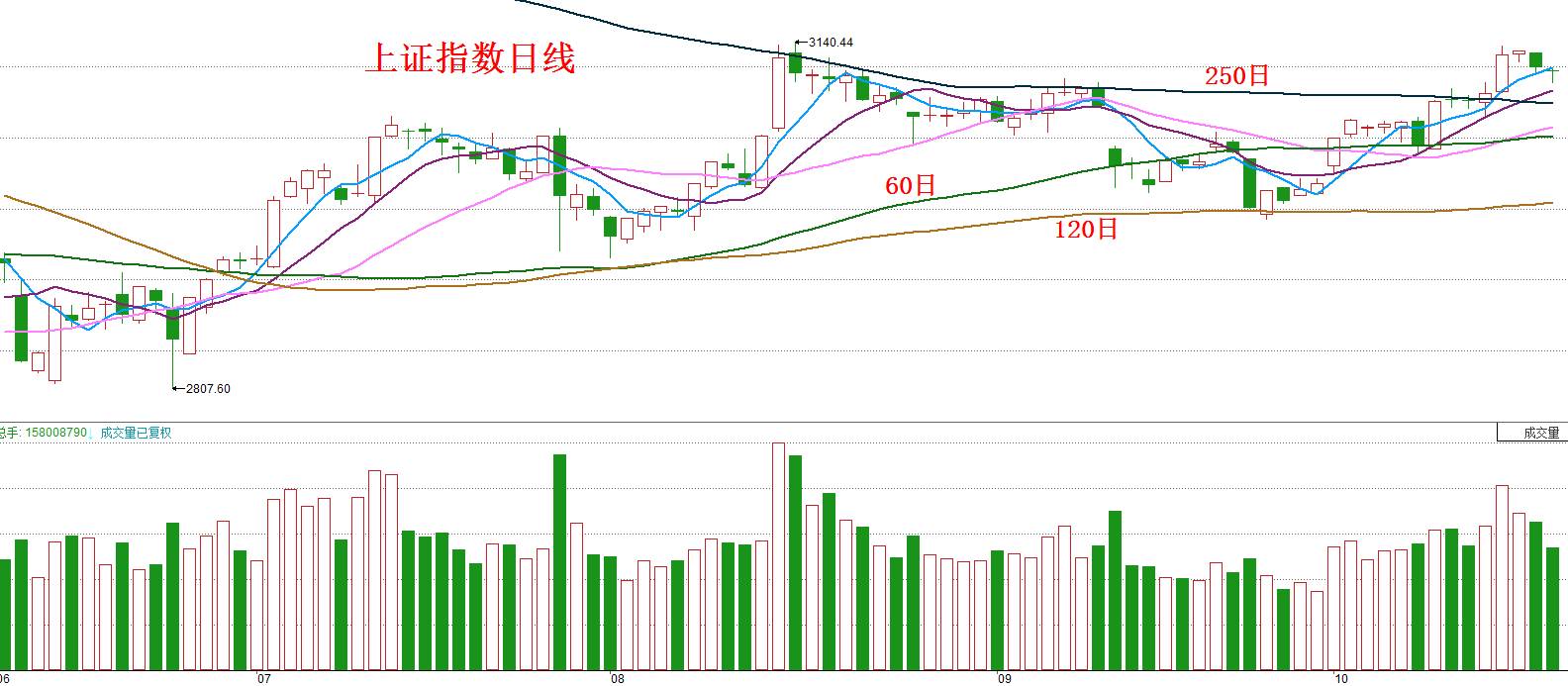 在此前相当长的时间内,姚尧一直强调上证指数是在走底部对称三角形。自8月15日的放量中阳后,姚尧又指出三角形已经向上突破,并由此可计算出其第一目标涨幅为3540点,如下图所示: