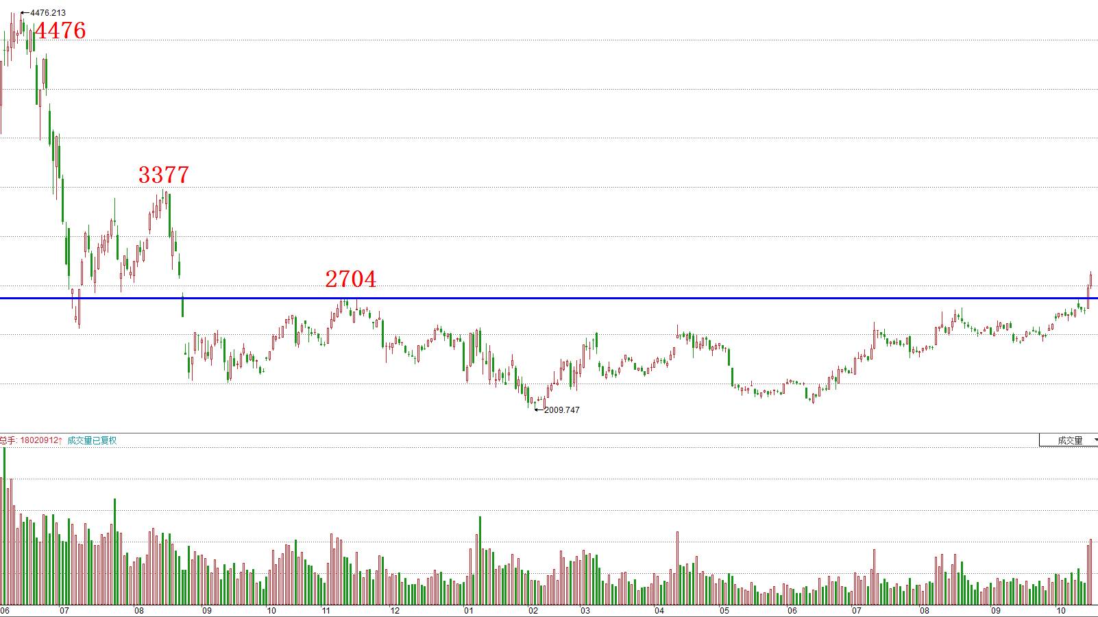 可以看出,煤炭指数的走势基本与上证指数相同,只是近两天的大涨才突破了去年11的波段高点,相当于上证指数3684点的位置。然而,煤炭价格是从去年11月才开始上涨,至今已涨了150%左右,可煤炭股却只收复去年11月时的股价,这显然是不合理的。而且从形态来看,这是个构筑长达一年的大底部。你可以说它是复合型双底,也可以说它是大型圆弧底,但无论如何应该不会有人觉得这不是底,且很容易看出这两天是放量突破颈线,既然如此,则未来必定还有一大段涨幅。