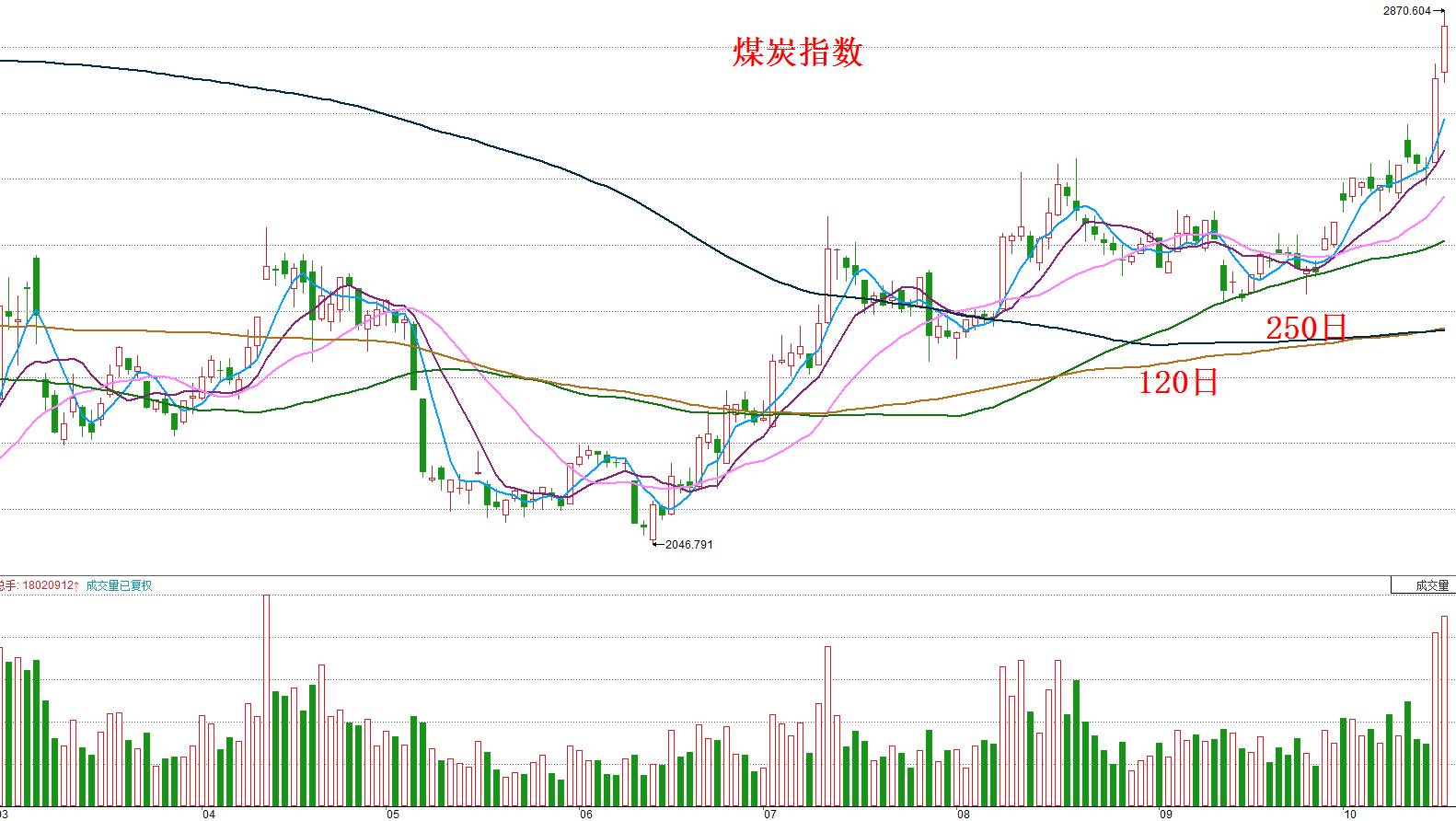在此前的文章中,姚尧多次提到过250日均线拐头向上通常都会有一波可观的行情。现在上证指数还是刚刚站稳250日均线,可煤炭指数的250日均线已经明显拐头向上。且120日均线已于近日向上金叉250日均线,使得煤炭指数已经形成标准的多头排列,而这完全是牛市的风采!