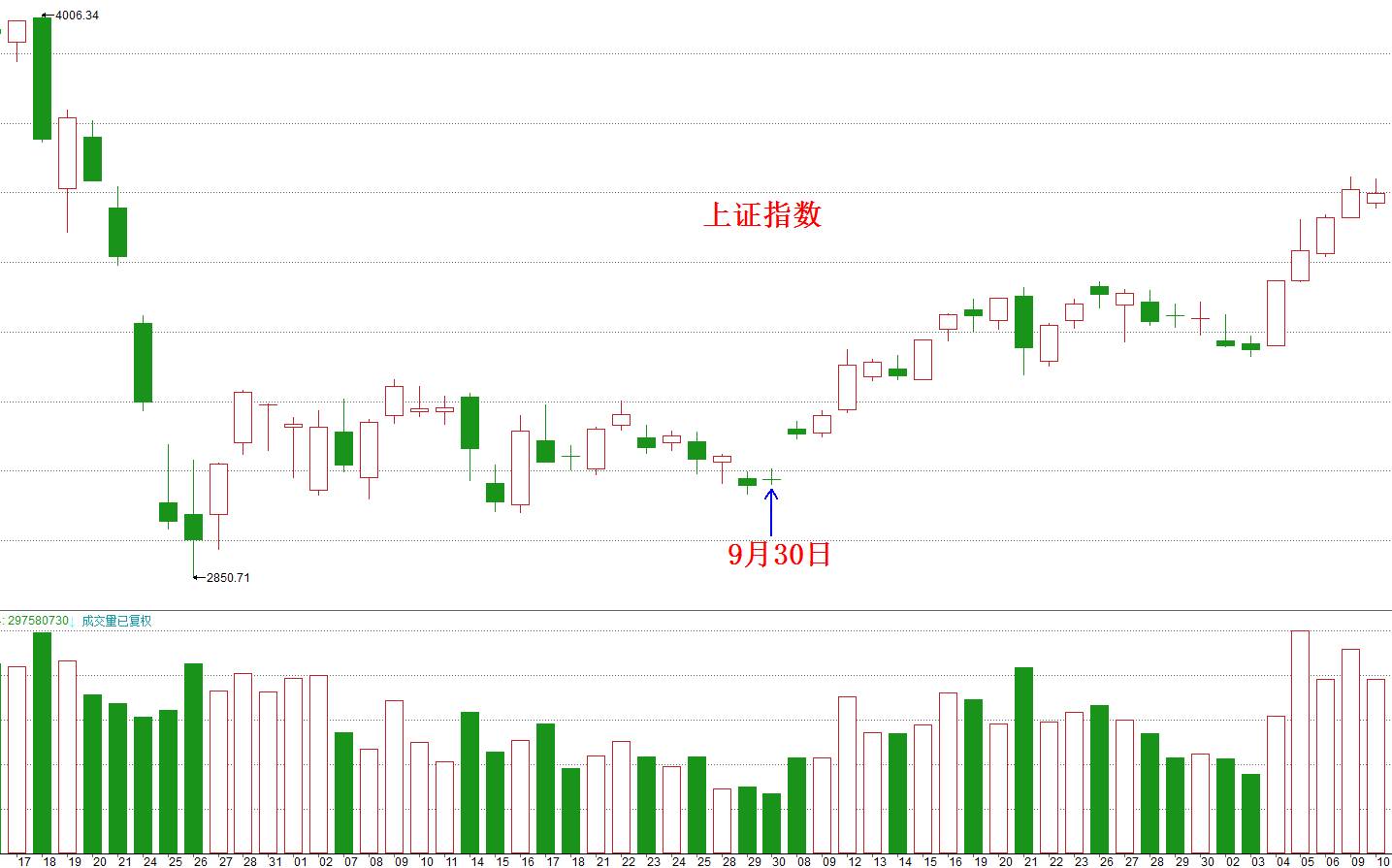 可以看到,在内地国庆放假期间,香港恒生指数是上涨的,而且这个上涨已经收复了9月22日以来的跌幅,也封闭了9月12日的跳空缺口。换句话说,比照港股国庆节前后的走势,现在上证指数应该站上3050点才算合理。