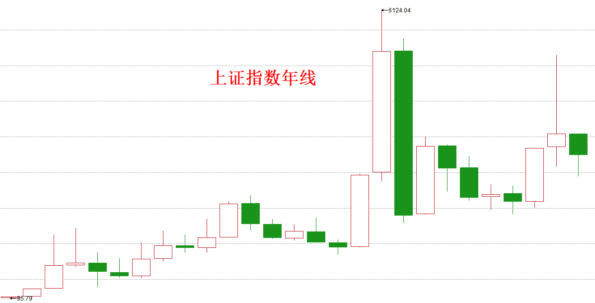 在此前的文章中,我们曾数次讨论上证指数年K线的问题,现在再说一次。请看下面这张上证指数有史以来的年线图: