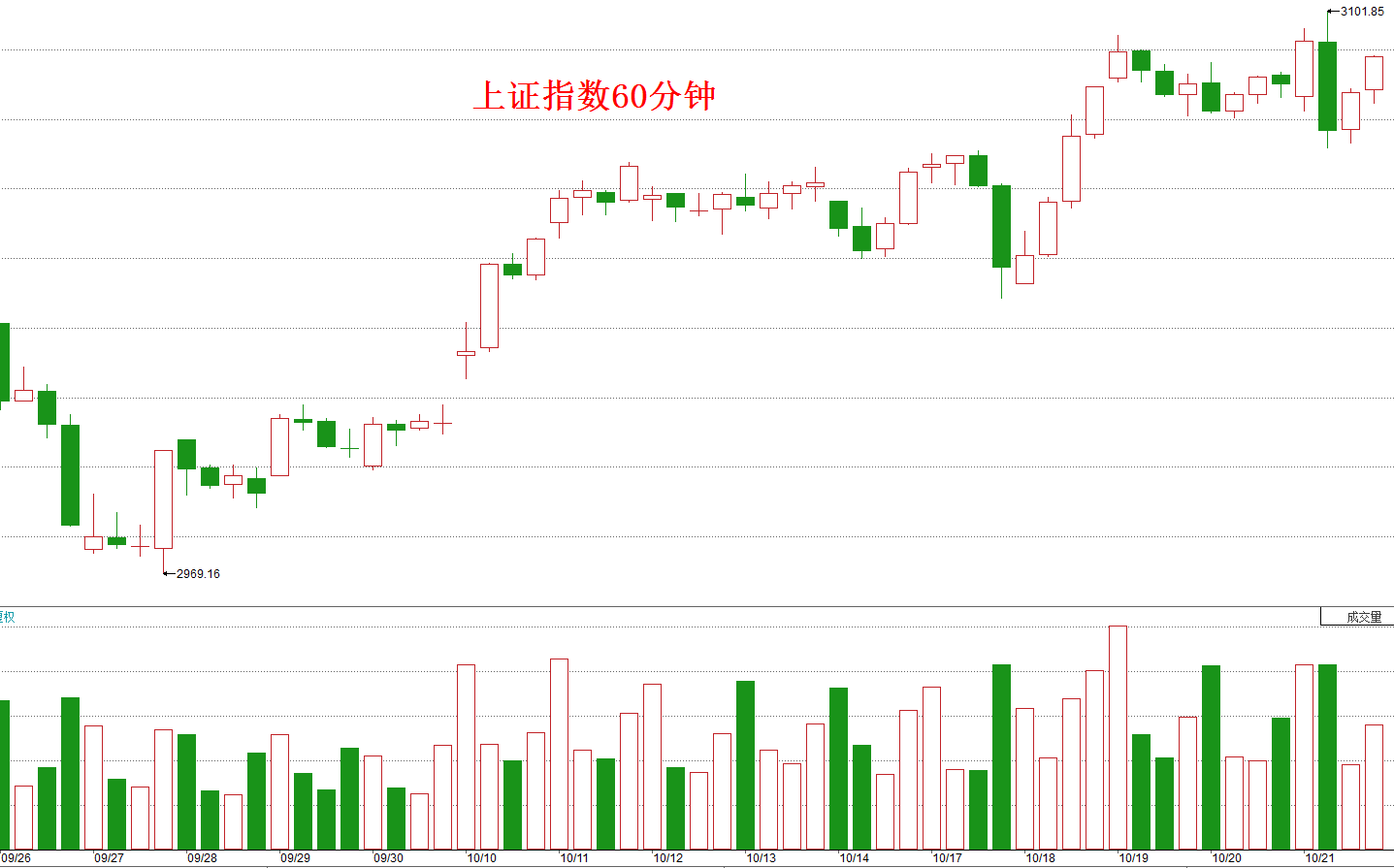 周五上证指数上涨6.48点,收盘报3090.94点,成交量为2020亿元,如下图所示: