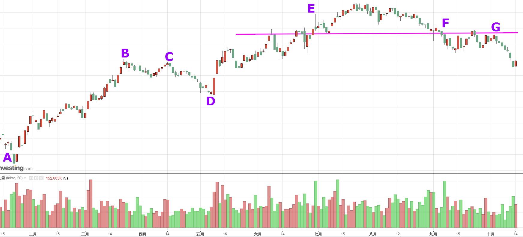 E点:6月30日,杜特尔特正式就职,并发表就职演说。当天,菲律宾指数冲高回落收出巨量长上影线,有经验的投资者都知道,这其实是个指数即将见顶的信号,因为有主力资金开始选择抛售了。那么,主力资金为什么在5月10日以连续长阳的方式对杜特尔特表达善意,6月30日却开始大幅抛售呢?原因只有一个,杜特尔特的反美倾向让国际资金对其彻底不抱希望。