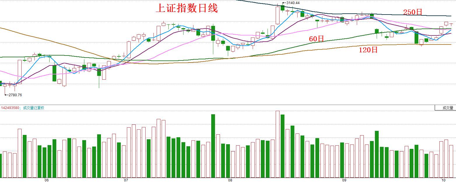 在八月中旬和九月上旬,上证指数曾经数次触碰到250日均线,可终究未能成功站住。没有站稳的原因,一方面固然是因为指数上涨乏力,另一方面也是因为250日均线始终未能快速下滑。可一旦250日均线在未来近三个月的主基调都是以下滑为主,则不仅是指数的K线,包各条短、中、长期均线都会与逐步向上金叉250日均线,最后形成所有均线多头排列的攻击态势,这也就是我们梦寐以求的大牛市了。疑问只在于时间上是早几个月或晚几个月,但一定不会缺席,而且也不用等太久时间了。