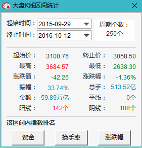 可以看到,从今天往回数250个交易日就是在去年的9月29日,那么明日250日均线扣除的位置就是去年的9月30日。去年9月30日的收盘价为3052.78点,与今天的收盘价基本持平,因此只要明天上证指数不出现大涨或大跌,那么250日均线就应该还是走平的。后天,上证指数250日均线扣除的位置将是去年10月8日,收盘价在3143.36点,比现在的点位高,因此后天的250日均线必定是下移的。由于去年十月之后上证指数一路上涨至3600多点,且十一月和十二月始终维持在3450上方震荡,故而未来上证指数将会有相当长一段时间250日均线是向下运行的。其实,最近一个半月的250日均线也是逐渐下移的,只是下移的速度极其缓慢,因为其扣除的位置在去年的八月下旬到九月底,和现在的点位相差不大。可是从后天开始,250日均线下移的速度会明显加快。
