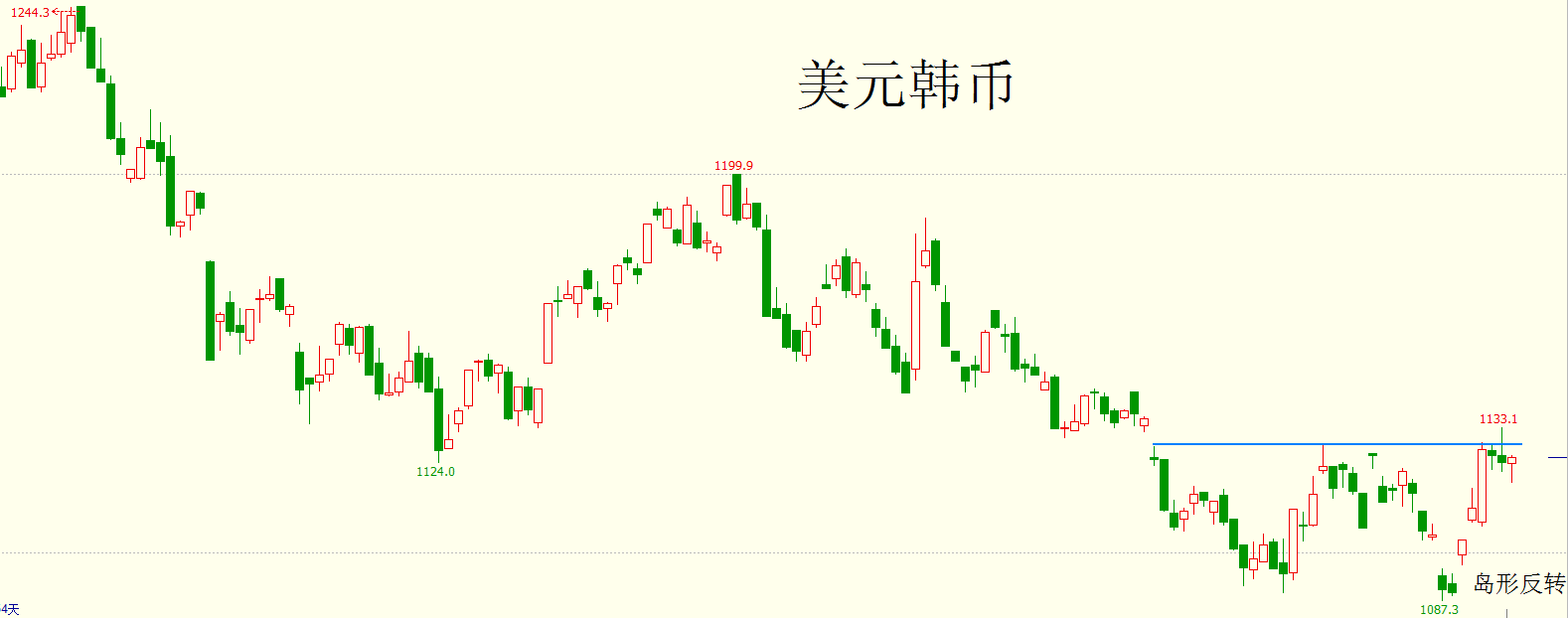 可以看到,美元韩币现在像是在构筑双底,而且在第二个底的位置出现了岛形反转。虽然现在还没能有效突破颈线,但说美元韩币现阶段是在筑底,未来韩币贬值的可能性非常大,这应该是没什么问题的。