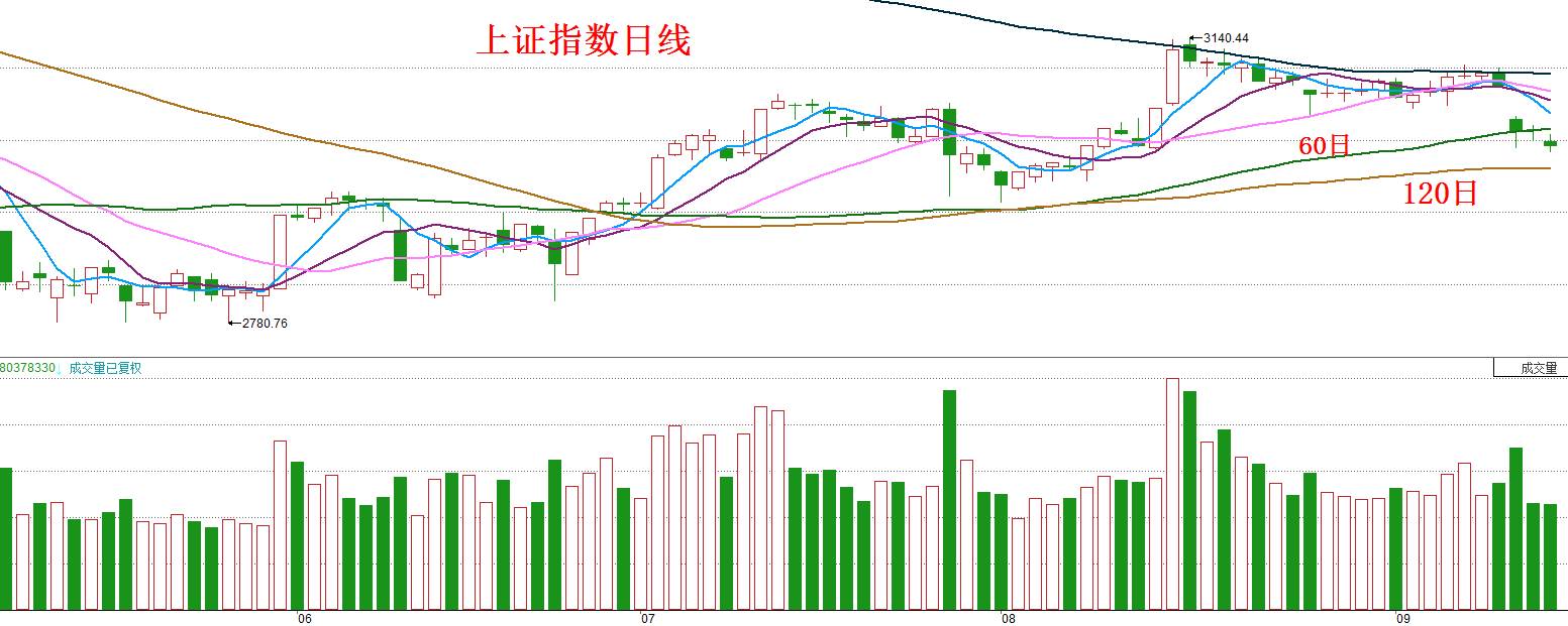 我们反复提到,前期迭创新高的美股是假突破,理由是突破后就上涨乏力,而且成交量越来越小,尤其上涨时的量总是没有下跌时的量大。9月9日(周五),标普500指数放量跌破颈线。12日(周一),指数大幅反弹,但最终未能收复颈线,成交量也是小于上周五的。之后几个交易日,指数都是在颈线下方运行,且阴线成交量大于阳线,表明指数这次已经构成有效跌破。周五时指数虽然下跌不多,但又爆出巨量,显示市场出现巨大分歧,又有一大批资金选择卖出了。