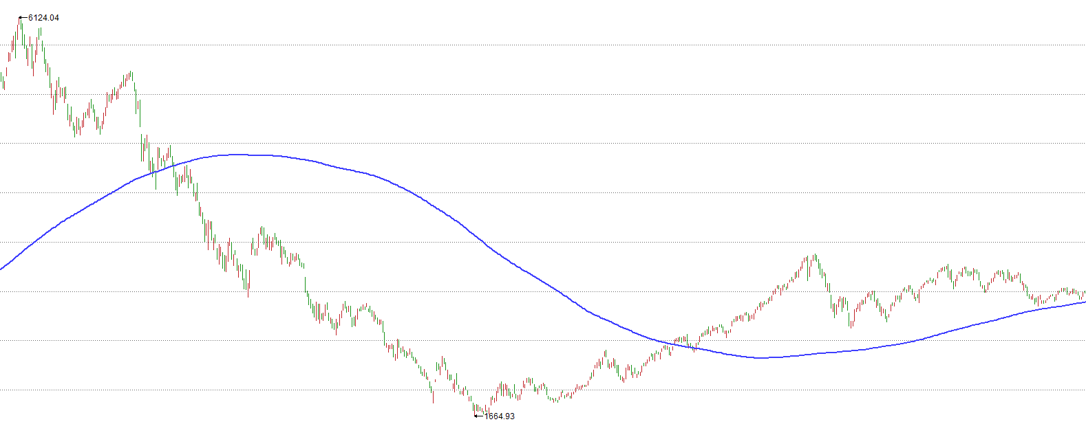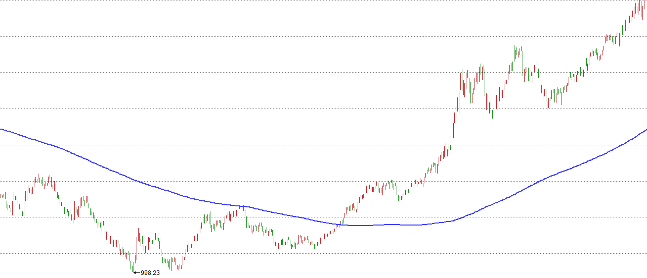 上面这张是2005年上证指数见998点底时的走势图。上证指数在2005年6月见到998点的最最低位,250日均线自2006年1月开始走平,四月开始拐头向上。之后上证指数一直涨到了6124点。