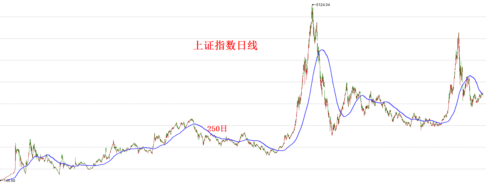 这张是上证指数有史以来的走势图。我们大致可以看出,只要上证指数的250日均线拐头向上,那么就必定会有一波像样的行情。接下来我们选择其中几段拆开放大: