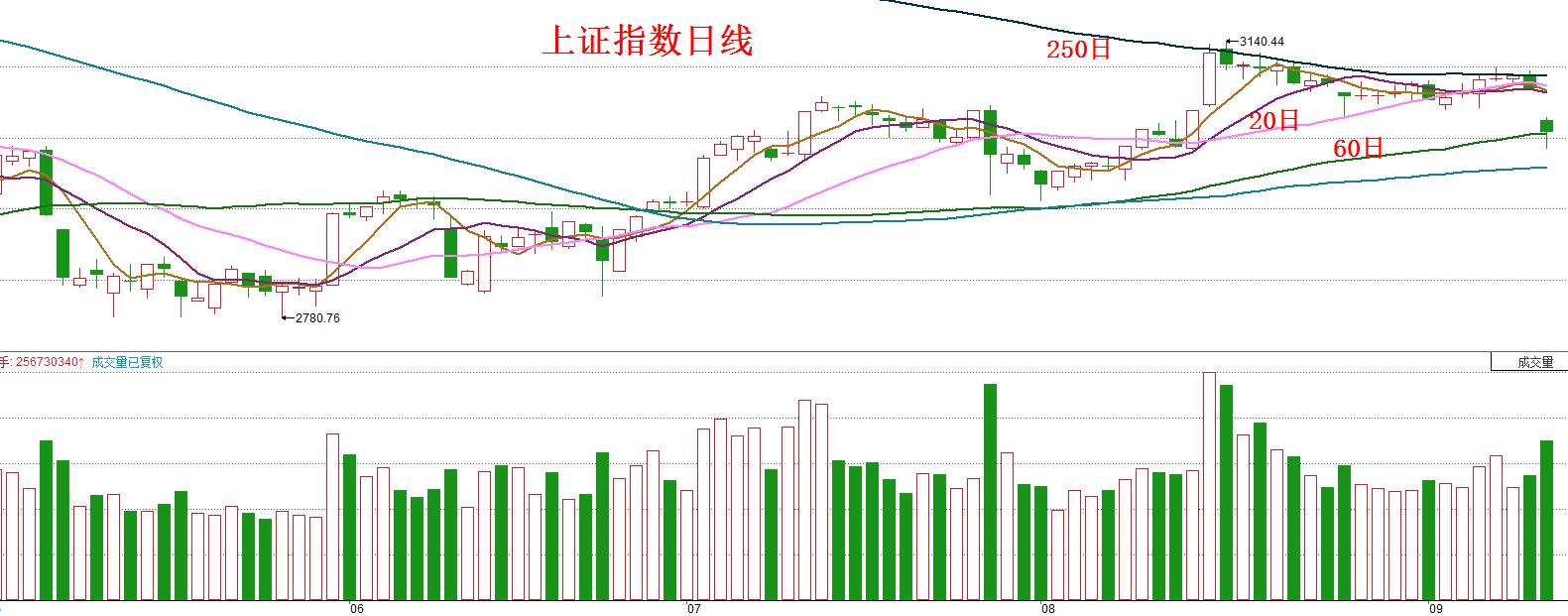 如果要估算明天250日均线的位置,那就是用今天的收盘价3021.98减去年9月8日的收盘价3170除以250,再加上今天的250日均价3095.86,等于3095.27点。由于明天抵偿的价格比扣除去年9月8日的价格要低,所以明天的250日均价就必定是较今天的更低的。我们看五月和六月份时候的250日均线下降的速度很快,原因就在于它扣除的是去年五六月的位置,那时候上证指数处在高位。而八月底以来,250日均线变得很平,原因则是现在和去年同期的指数点位相仿,扣除几乎等于抵偿,那均线就开始走平了。
