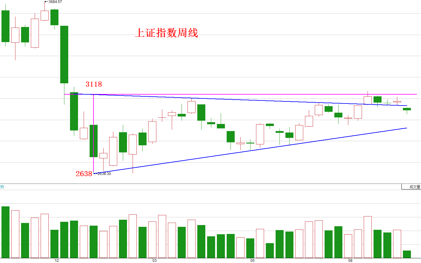 在昨晚文章中,我们提到最坏的结果就是像7月27日那样跌至60日均线,今天上证指数虽然一度跌穿,但终究还是收在了60日均线上,勉强还算是在预期之内。我们再来看下面这张上证指数周线图: