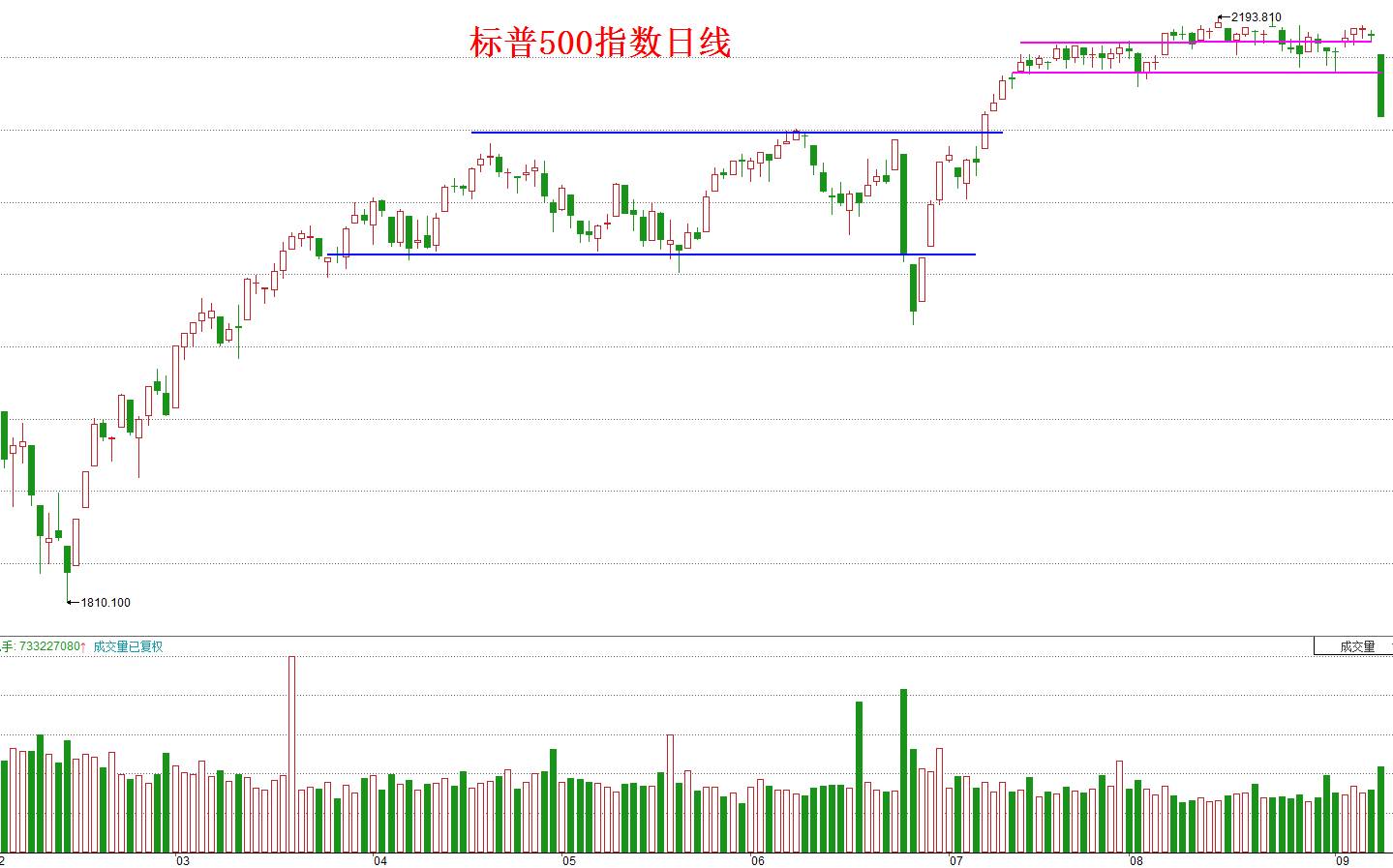 请大家仔细观察图中粉红色所标注的狭窄区间,这个区间共有40个交易日,差不多两个月的时间,看起来它是不断震荡创新高的,可是涨幅却非常狭小,上下也就不到3%的震幅,而且每次涨的时候成交量都比较小,跌的时候成交量都比较大,而周五这根大跌,标普500指数又是放量的。我在《8月12日股市前瞻》中提到:“美股正在构筑大头部,大家正好隔岸观火,看看大头部是怎样构筑出来的,因为你以后肯定也还是要多次遇到大头部的。”现在大家应该有非常深刻的印象了,指数构筑头部最明显的特征就是涨时缩量,跌时放量。过去两个月,看起来好像美股在不断创出历史新高,可是一根阴线杀下来,这两个月的投资就全部被套在高位了。所以说,投资要有前瞻性,这点非常重要。倘若你非得等指数大跌下来才考虑要不要割肉,这个就比较痛苦了,而且按照绝大多数散户的心理和性格,是不愿意在跌势初期卖股票的,他们渴望能从媒体和砖家那里获取信心,告诉他们接下来还会有反弹,还会创新高。