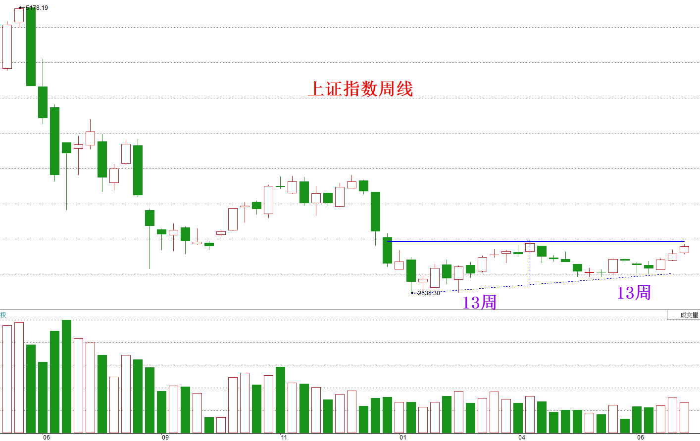 我们可以看到,以四月中旬的3097点为界,左边是十三周,右边也是十三周,对称性非常好。因此,突破颈线的最佳时机就在眼前了。