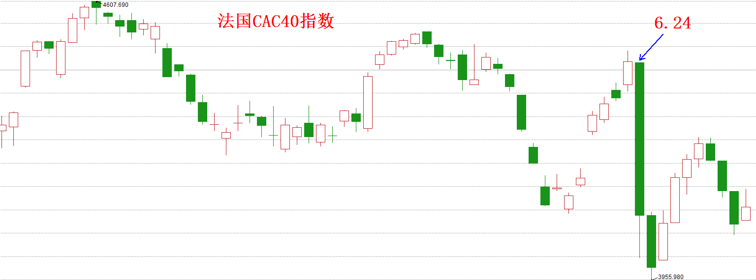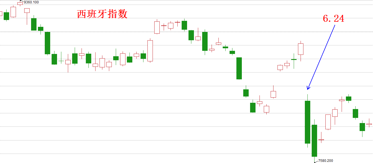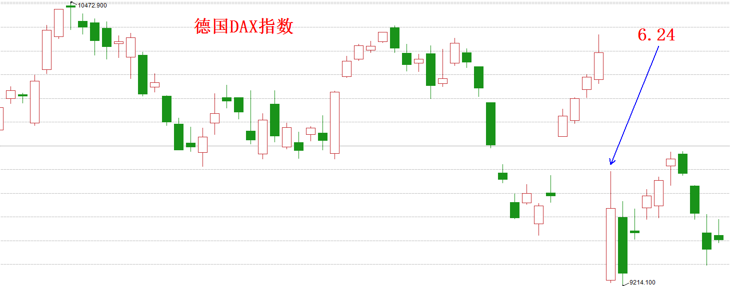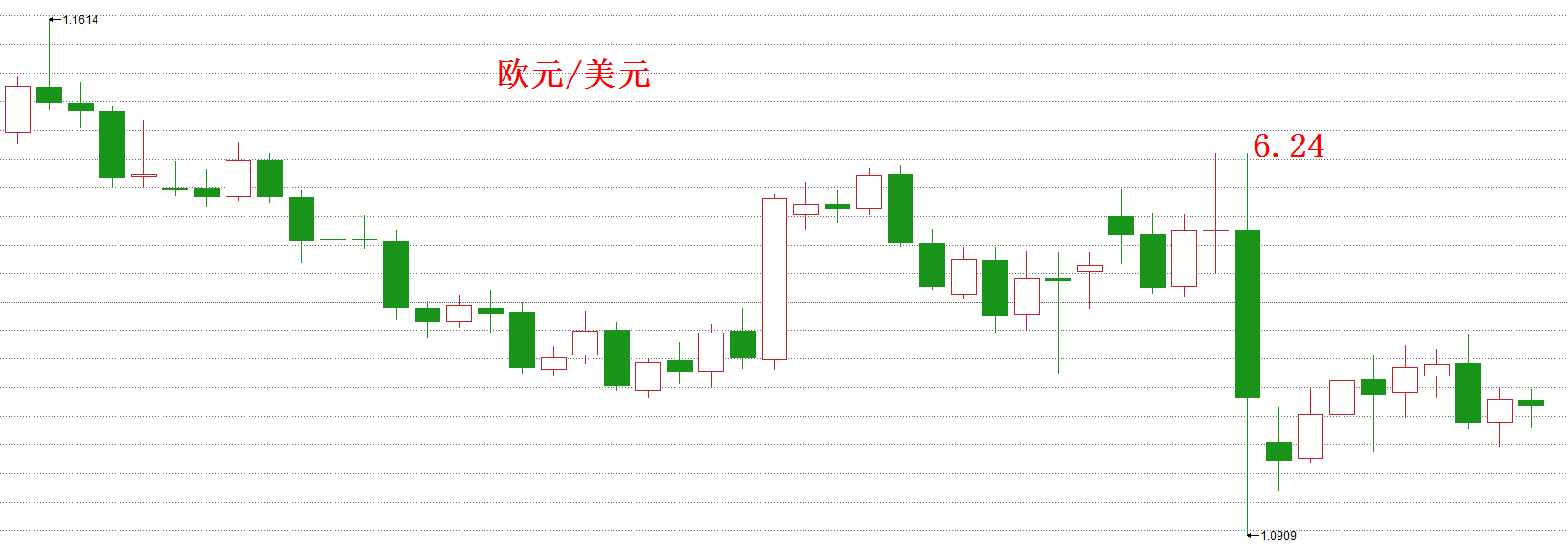从图中可以看到,就在6月24日英国脱欧当天,欧元出现了重贬,尾盘时才略有拉升,之后近半个月基本上就在6月24日当天的最低价和收盘价之间窄幅震荡。