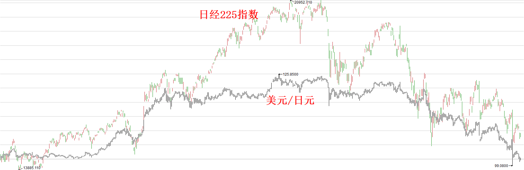 我们可以清楚地看到,正是日元的贬值(往上是贬值)和日股的走牛刚好是完全同步的。